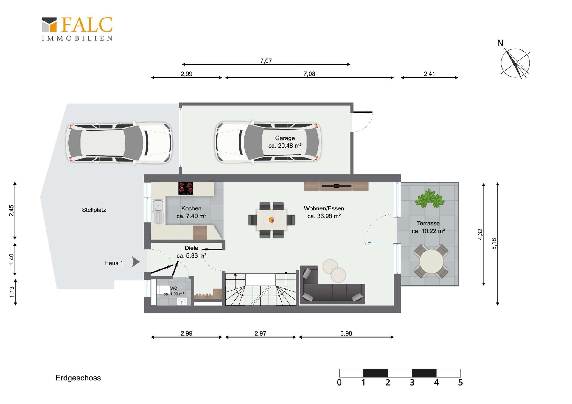 Beim Betreten des Hauses werden Sie im Erdgeschoss von einer einladenden Diele empfangen, die genügend Platz für eine Garderobe und ein Schuhregal bietet. Direkt zur Rechten befindet sich ein praktisches Gäste-WC, bevor Sie weiter in den großzügigen, offenen Wohn- und Essbereich mit einer offen-gestalteter Küche gelangen. Dieser Raum ist das Herzstück der Immobilie und bietet reichlich Platz für eine moderne Küche, eine gemütliche Essecke sowie einen behaglichen Wohnbereich. Ideal für gesellige Abende mit Familie und Freunden. Der direkte Zugang zur Terrasse und zum Garten sorgen für zusätzlichen Komfort ins Freie.
