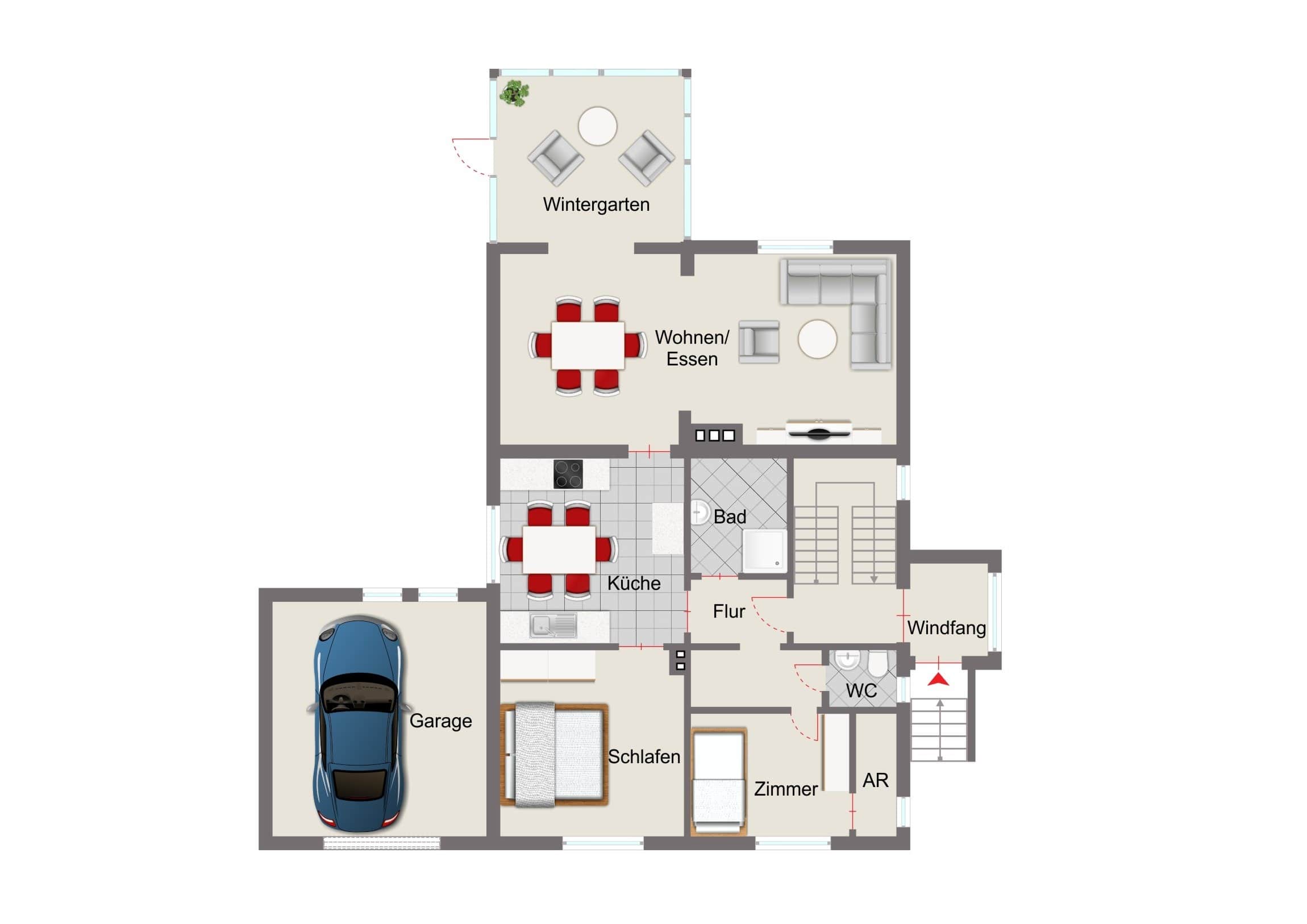 Verschiedene Fenstertypen, Rollläden, Wintergarten, Einbauküchen, Vollkeller, Ölzentralheizung, Garage