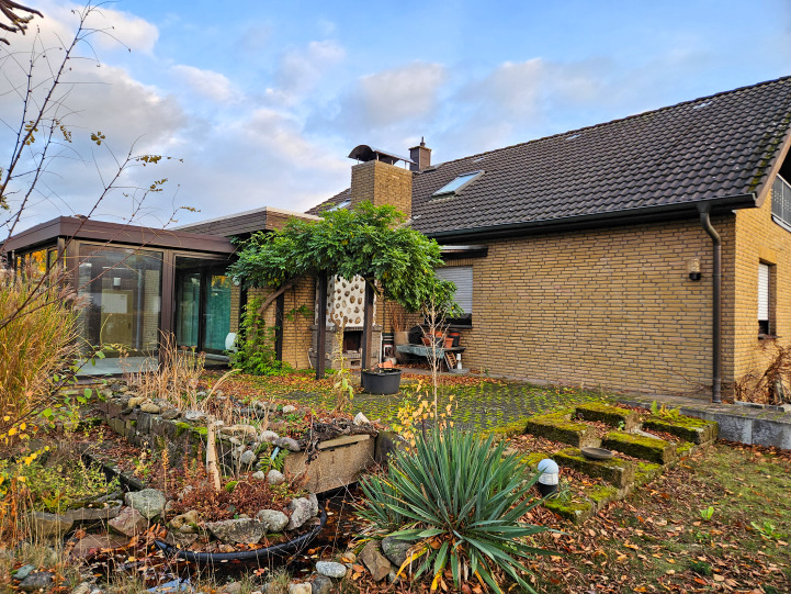 Das Wohn- und Esszimmer mit offener Küche bildet das Herzstück des Hauses. Ein Kamin sorgt an kühleren Tagen für eine behagliche Atmosphäre. Von hier aus gelangen Sie durch den Wintergarten auf die Terrasse, die sich hervorragend für entspannte Stunden im Freien eignet. Ein Außenkamin verleiht dem Gartenbereich zusätzliche Aufenthaltsqualität und macht ihn zu einem besonderen Highlight.