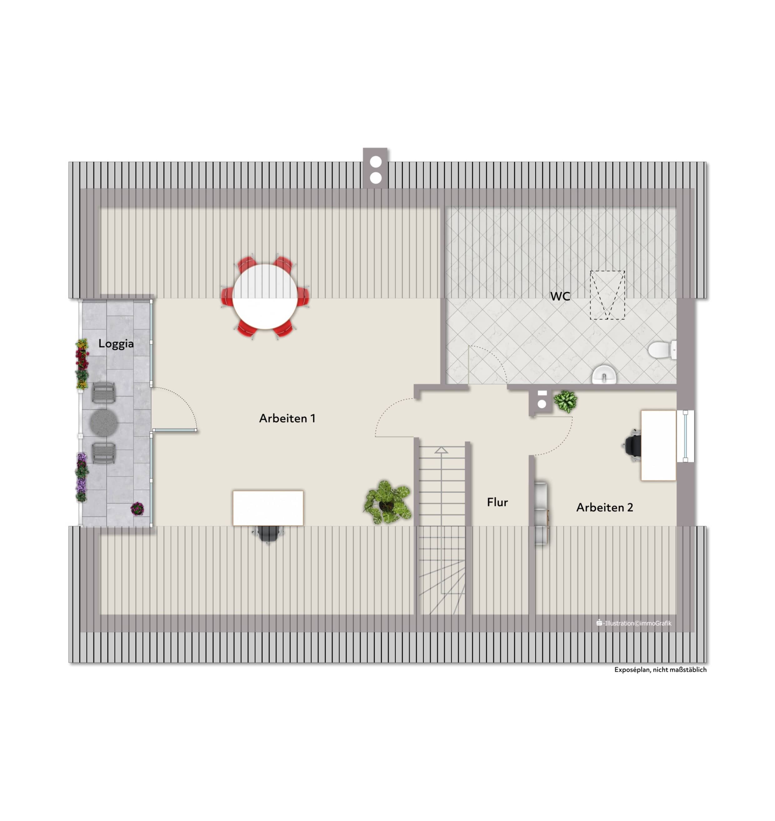 Im Dachgeschoss stehen der Familie weitere Rückzugs- und Nutzungsmöglichkeiten zur Verfügung. Hier befinden sich zwei zusätzliche, vielseitig nutzbare Zimmer, beispielsweise als Hobby- oder Arbeitsräume. Besonders hervorzuheben ist eines der Zimmer mit großzügigem Zuschnitt und direktem Zugang zur Loggia. Ein weiteres Badezimmer im Dachgeschoss ergänzt das Raumangebot und sorgt für zusätzliche Entlastung im Familienalltag.