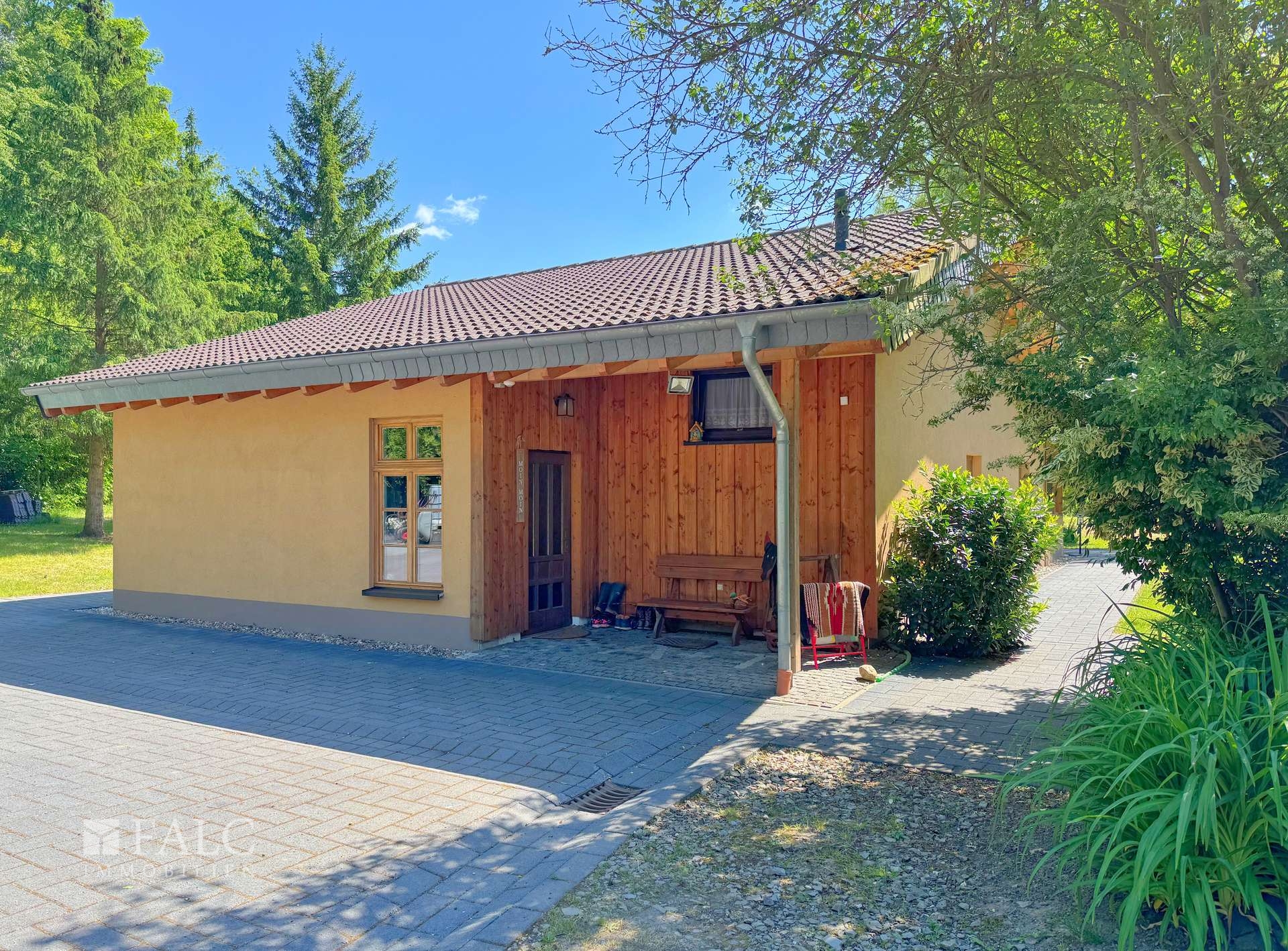Vom Wohnbereich aus gelangen Sie zur überdachten Terrasse mit Rundbögen und Holzverkleidung – ideal als Outdoorküche oder ganzjähriger Freisitz. Der Blick fällt auf Stallung, Natur und die imposante alte Trauerweide – das emotionale Zentrum des Anwesens.
