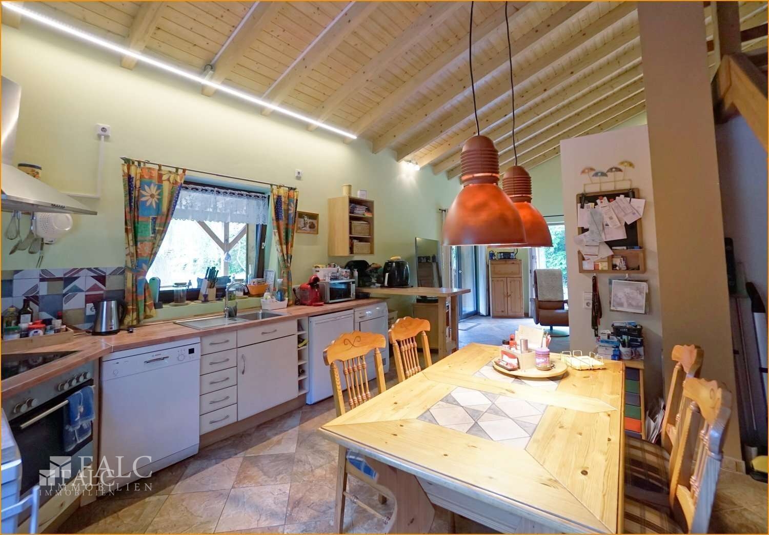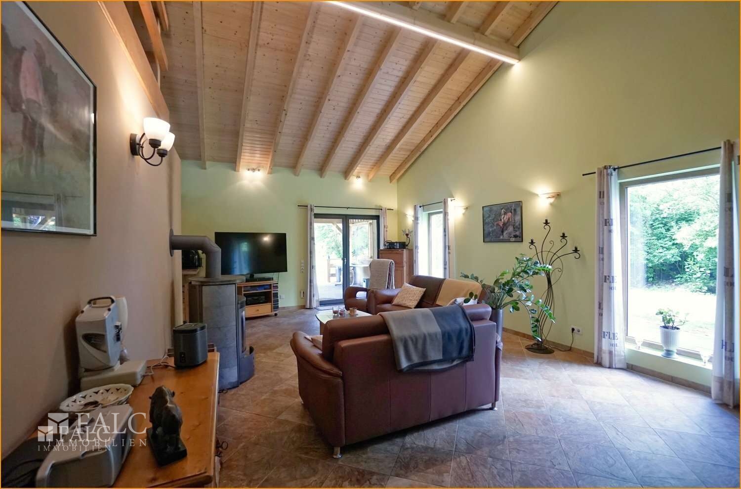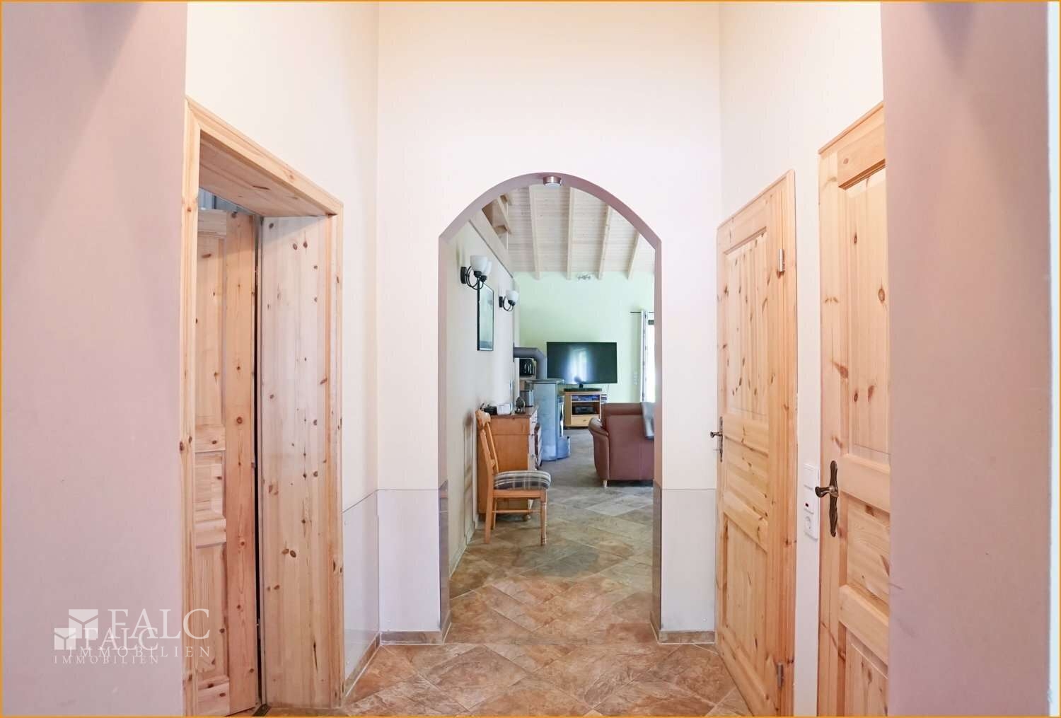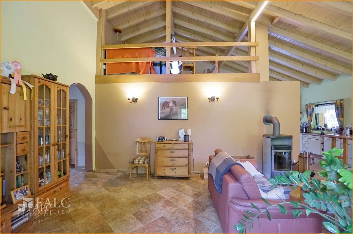 Der weitläufige Wohnbereich, zugänglich durch einen Rundbogen, beeindruckt mit offener Balkendecke aus edlem Fichtenholz, Kaminofen, und lichtdurchflutetem Ambiente. Hier trifft Wärme auf Großzügigkeit.