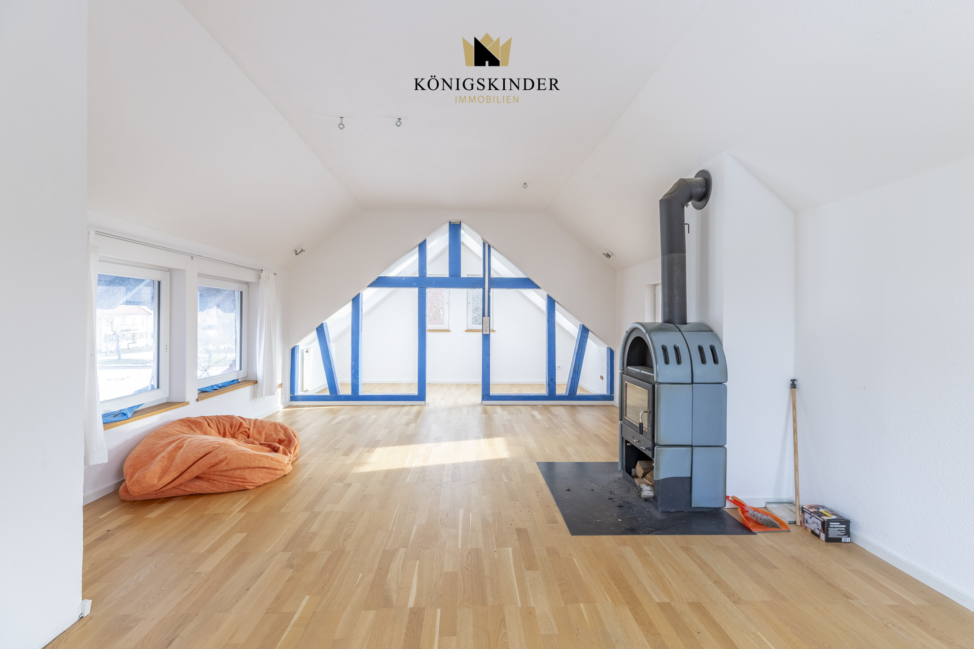 * Holzofen im Dachgeschoss