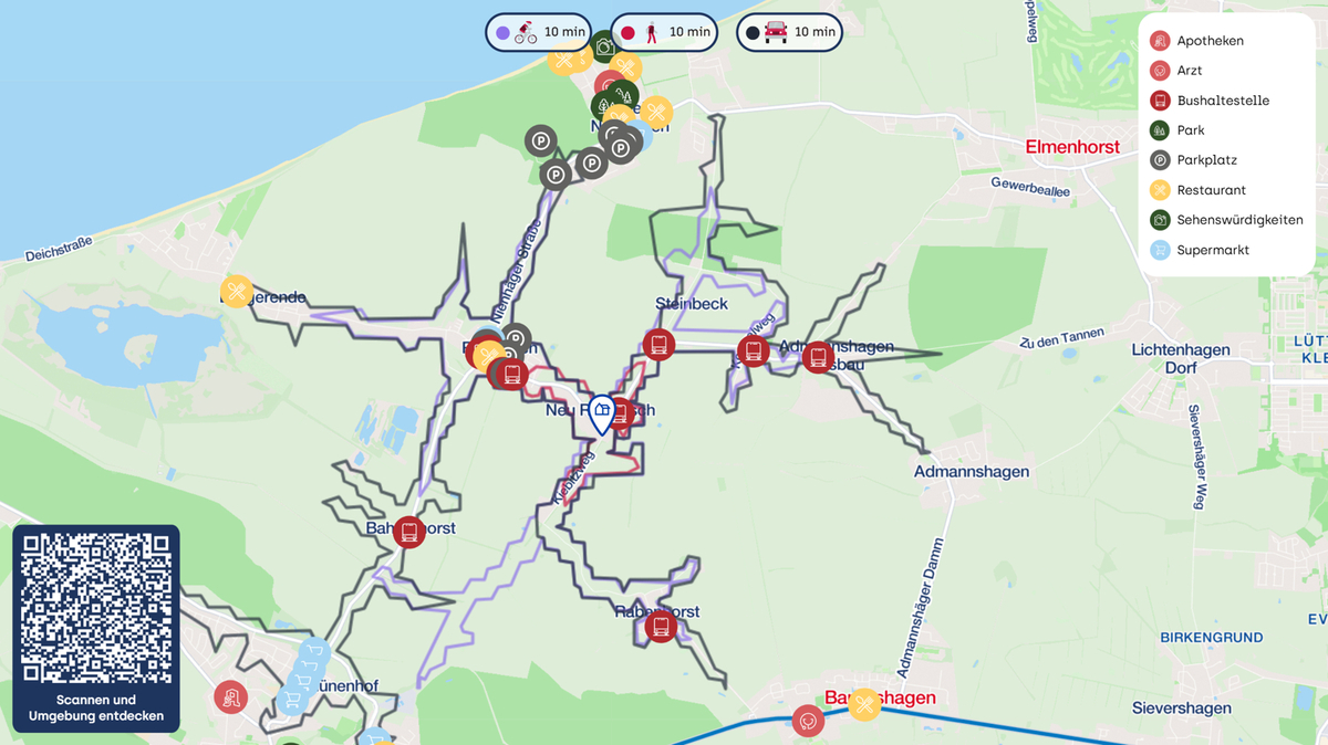 Bad Doberan bietet eine gute Infrastruktur mit Einkaufsmöglichkeiten, Schulen und medizinischer Versorgung. In Heiligendamm (8 km), dem ältesten deutschen Seebad, lädt die historische Bäderarchitektur zum Verweilen ein. Kühlungsborn (15 km) begeistert mit einer langen Strandpromenade, gehobener Gastronomie und vielseitigen Freizeitangeboten. Rostock, als wirtschaftliches Zentrum der Region, bietet zahlreiche kulturelle und berufliche Möglichkeiten.