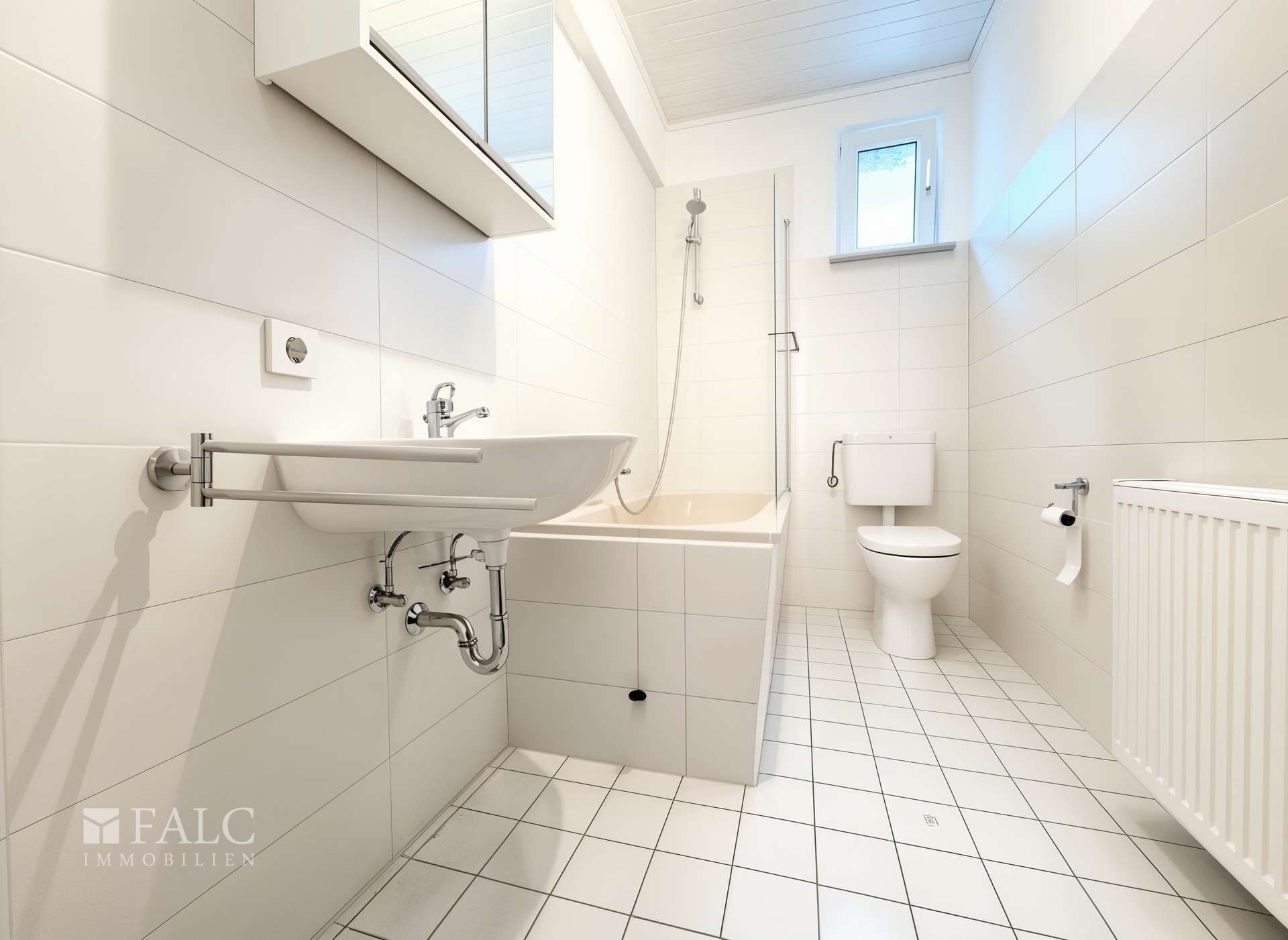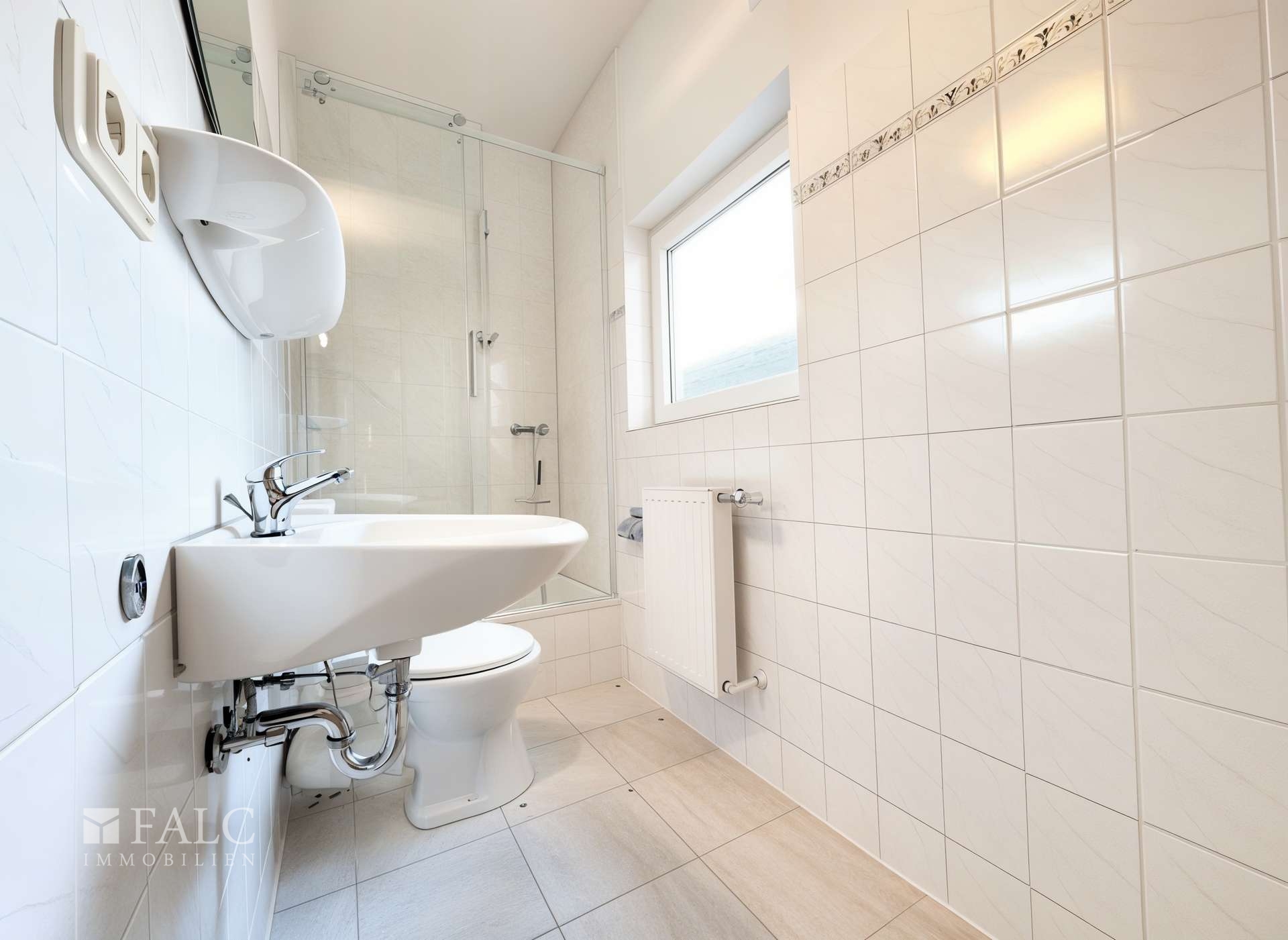 Die Bäder sind entsprechend ihrer Lage funktional aufgeteilt: Im Erdgeschoss befindet sich ein Badezimmer mit Badewanne, das sich ideal für entspannte Wellnessmomente eignet, während im Obergeschoss ein weiteres Badezimmer mit Dusche zur Verfügung steht – perfekt für eine schnelle und komfortable tägliche Nutzung.