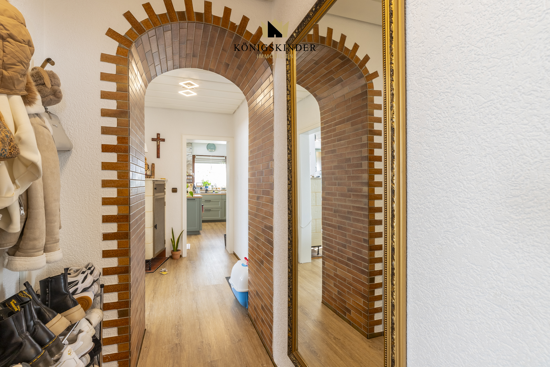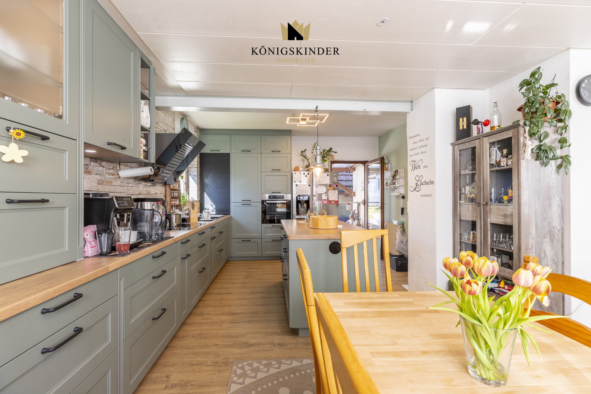 Erdgeschoss: •Flur mit Vinylboden und Treppenaufgang ins Obergeschoss •Zugang zum Keller •Helles Wohnzimmer mit großen Fenstern •Offener Übergang zum Essbereich •Moderne Einbauküche mit Kücheninsel (2021) •Direkter Zugang zur Terrasse •Schlafzimmer •Badezimmer mit vorhandenen Anschlüssen (noch nicht modernisiert) •Gäste-WC