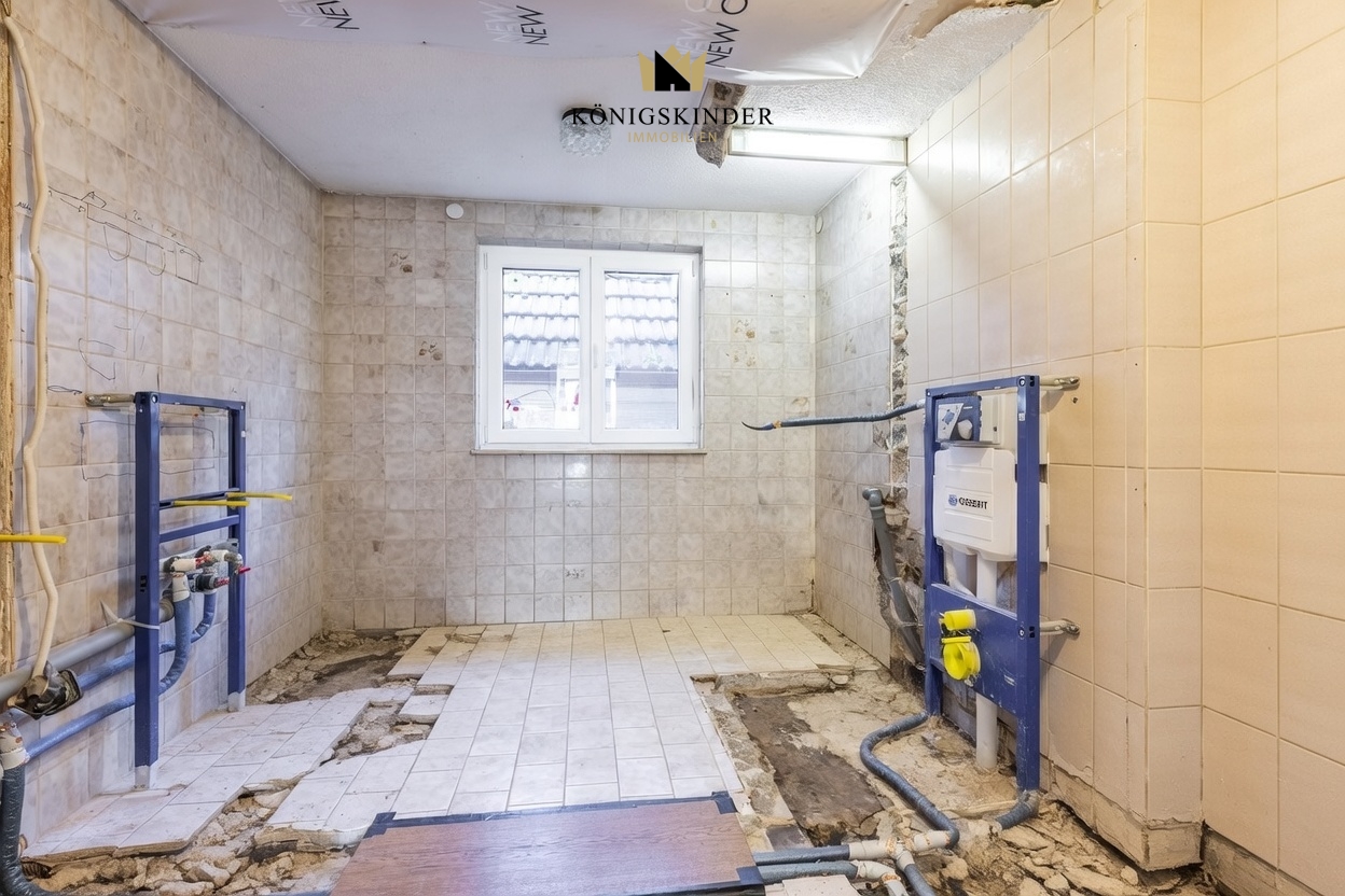 Erdgeschoss: Beim Betreten des Hauses gelangen Sie in einen Flur mit Vinylboden, von dem aus die Treppe in das Obergeschoss führt. Zudem besteht hier Zugang zum Keller. Über den Flur erreichen Sie den Wohnbereich, in dem sich auch ein Gäste-WC befindet. Der helle Wohnbereich bildet das Herzstück des Hauses. Große Fenster sorgen für viel Tageslicht und gehen fließend in den Essbereich über. Im hinteren Bereich befindet sich die hochwertige Einbauküche aus dem Jahr 2021 mit großzügiger Kücheninsel. Von hier aus gelangen Sie direkt auf die Terrasse, wodurch sich Innen- und Außenbereich harmonisch verbinden. Auf dieser Etage befinden sich außerdem ein Schlafzimmer sowie ein Badezimmer, das bislang noch nicht modernisiert wurde. Die entsprechenden Anschlüsse sind bereits vorhanden.