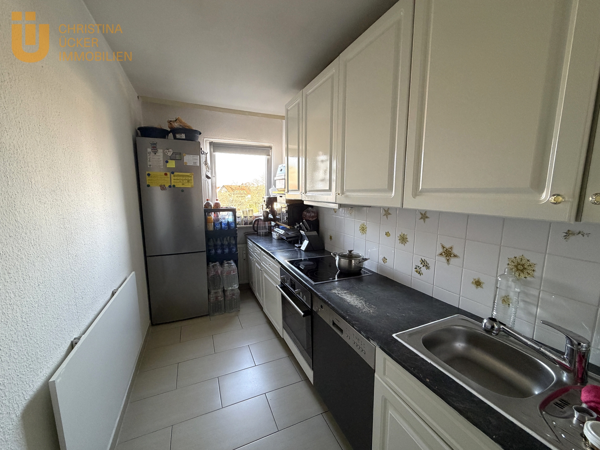Direkt zur linken Seite befindet sich die länglich geschnittene Küche, die derzeit im Eigentum der Mieter steht. Ebenfalls vom Flur aus erreichbar ist ein innenliegendes Gäste-WC.