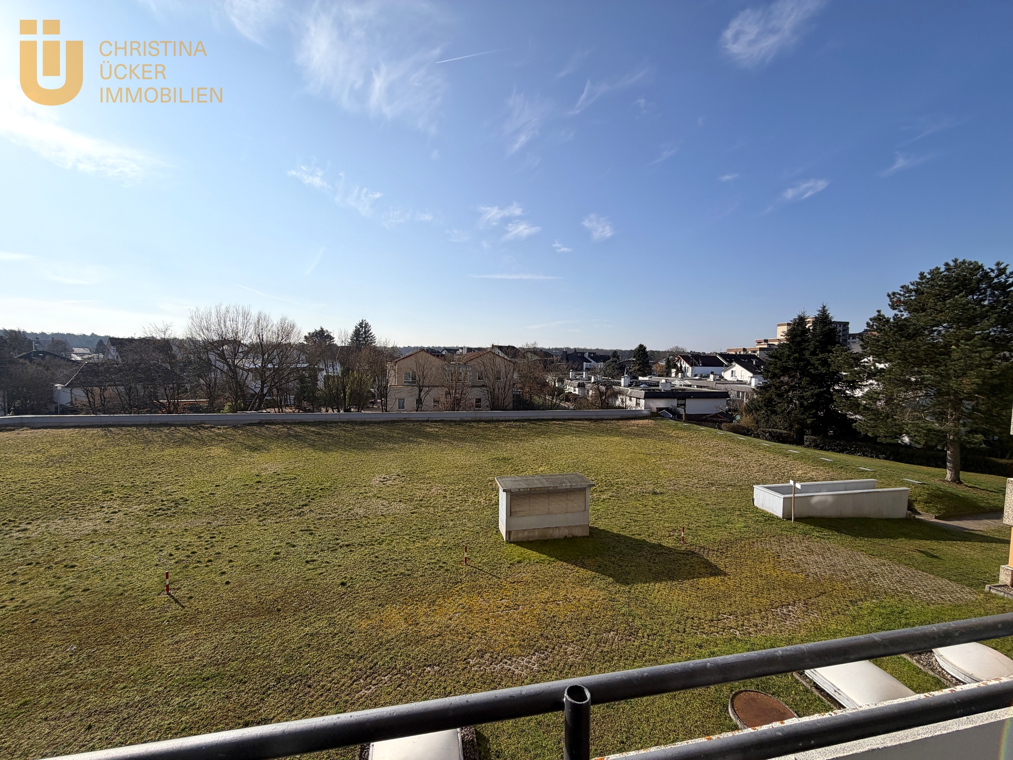 Von der Loggia aus bietet sich ein schöner, grüner Ausblick über die begrünte Tiefgarage sowie über die umliegenden Häuser des Wohngebietes „Breidert“ bis hin zum angrenzenden Wald.
