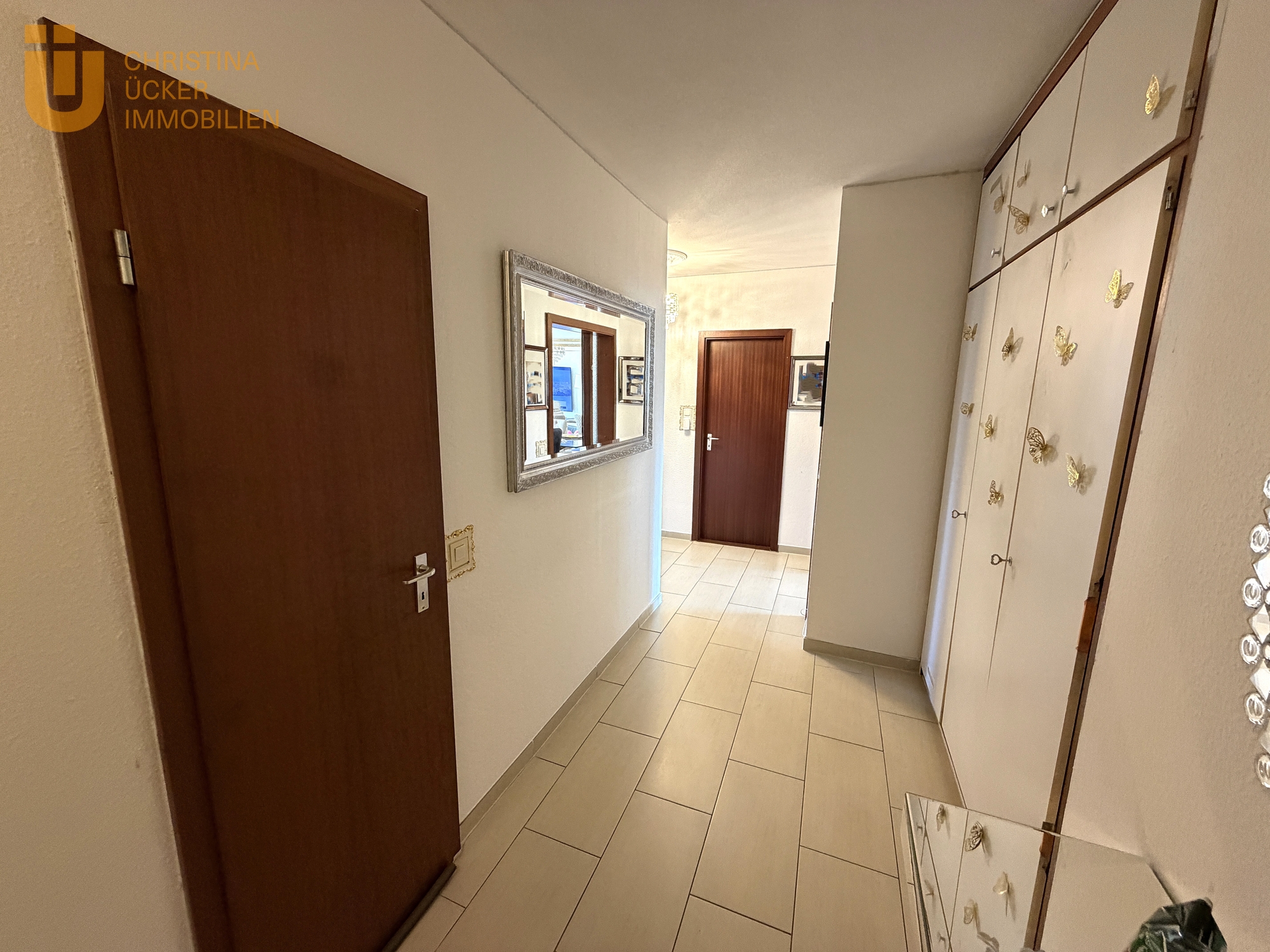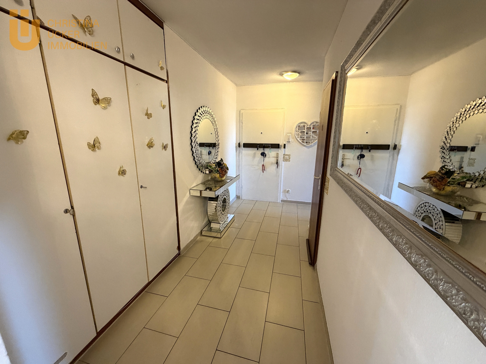 Beim Betreten der Wohnung gelangt man zunächst in den U-förmig angelegten Flur, von dem alle Räume der Wohnung zugänglich sind. Ein praktischer Einbauschrank bietet zusätzlichen Stauraum und eignet sich ideal als Garderobe oder zur Aufbewahrung von Haushaltsutensilien.