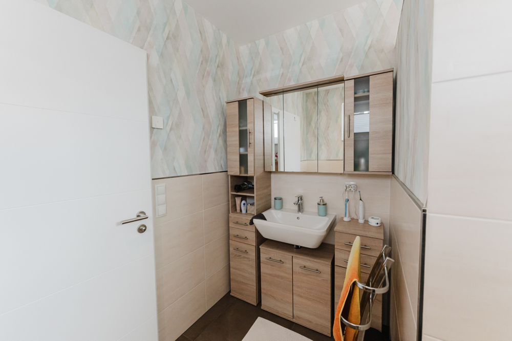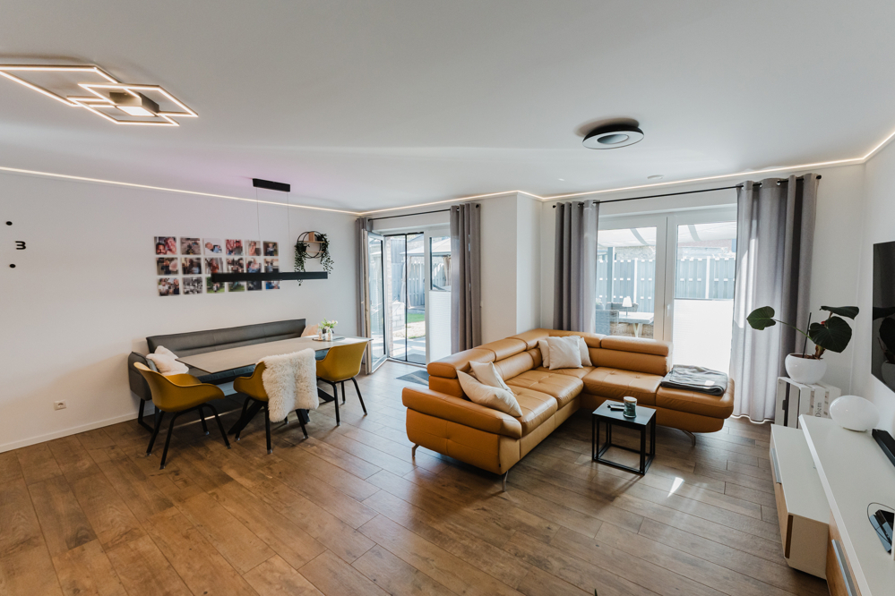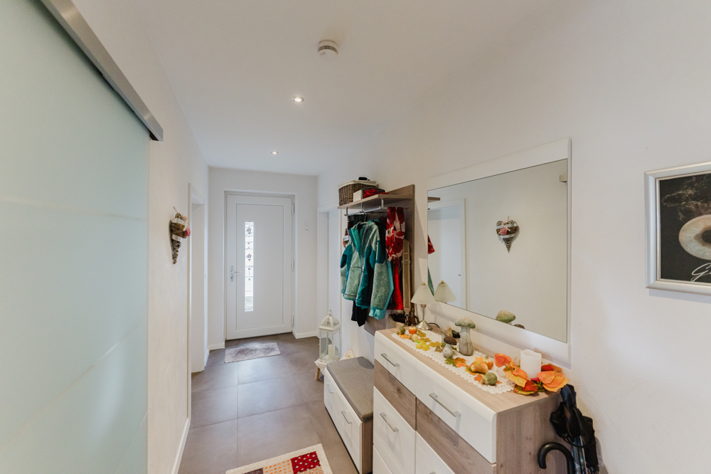 Das Haus präsentiert sich in einem äußerst gepflegten Zustand und wurde mit hochwertigen Materialien ausgestattet. Große Fensterflächen sorgen für lichtdurchflutete Räume und ein angenehmes Wohngefühl. Zur Ausstattung gehören eine Erdwärmeheizung, eine moderne Be- und Entlüftungsanlage mit App-Steuerung, ein Smart-Home-System von Eltako, ein Glasfaseranschluss sowie eine Fußbodenheizung in allen Räumen. Darüber hinaus ist eine Photovoltaikanlage mit 16 kW zur Eigennutzung vorhanden. In der Küche stehen Miele-Geräte und ein Quooker zur Verfügung, und auch die Gartenbewässerung lässt sich bequem per App steuern. Für E-Mobilität ist das Objekt bestens gerüstet: Eine Wallbox ist bereits installiert, eine zweite ist vorbereitet. Abgerundet wird das Angebot durch eine Garage, einen Abstellraum und PKW-Stellplätze im Freien.