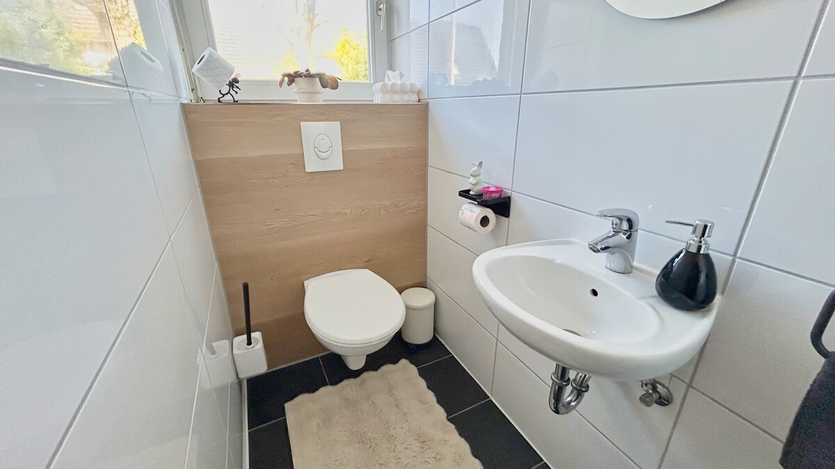 Das Badezimmer wurde bereits modernisiert und ist sowohl mit einer Dusche als auch mit einer Badewanne ausgestattet. Zusätzlich steht ein ebenfalls modernisiertes Gäste-WC zur Verfügung.