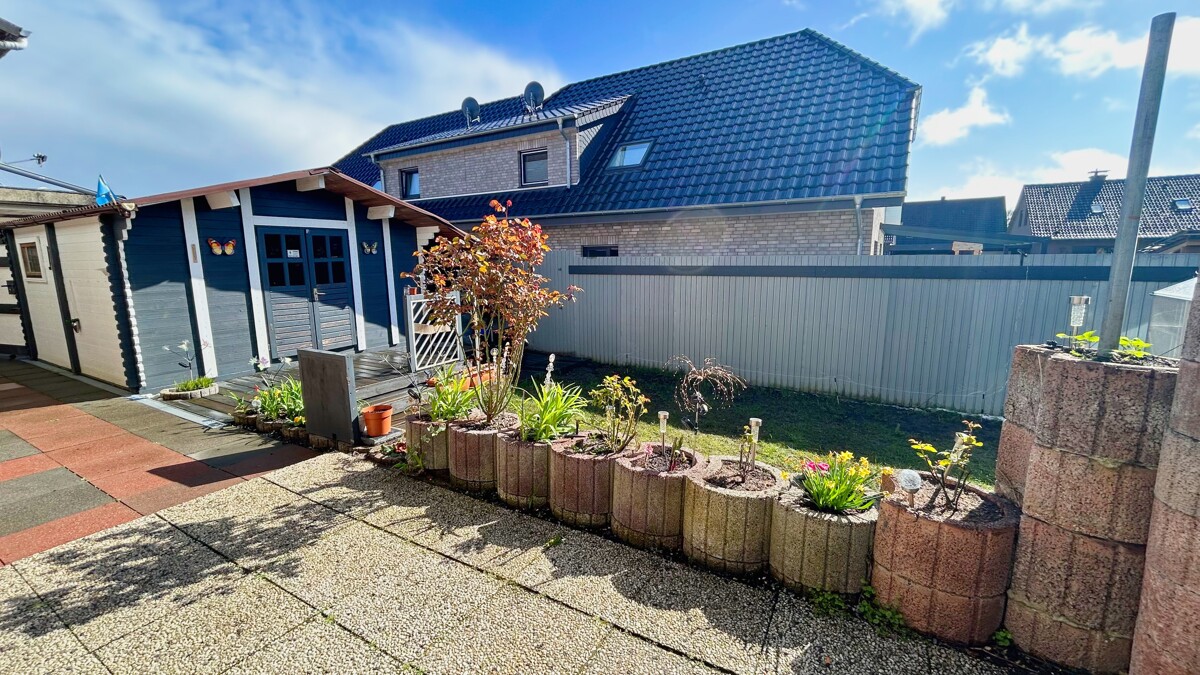 Auch im Außenbereich überzeugt die Immobilie: Der Garten ist schön angelegt und bietet neben einer angenehmen Privatsphäre praktische Zugänge sowohl zur Vorderseite als auch direkt zum Hinterhof und zur Garage.