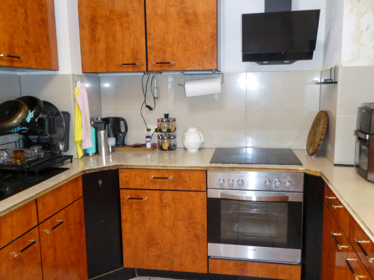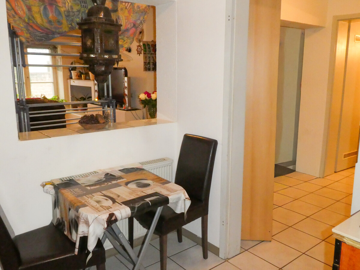 Die Küche ist separat angelegt mit einer Durchreiche ins Wohnzimmer. Ein kleiner Essplatz ist integriert. Das Badezimmer ist zeitlos gefliest und verfügt über eine Dusche.