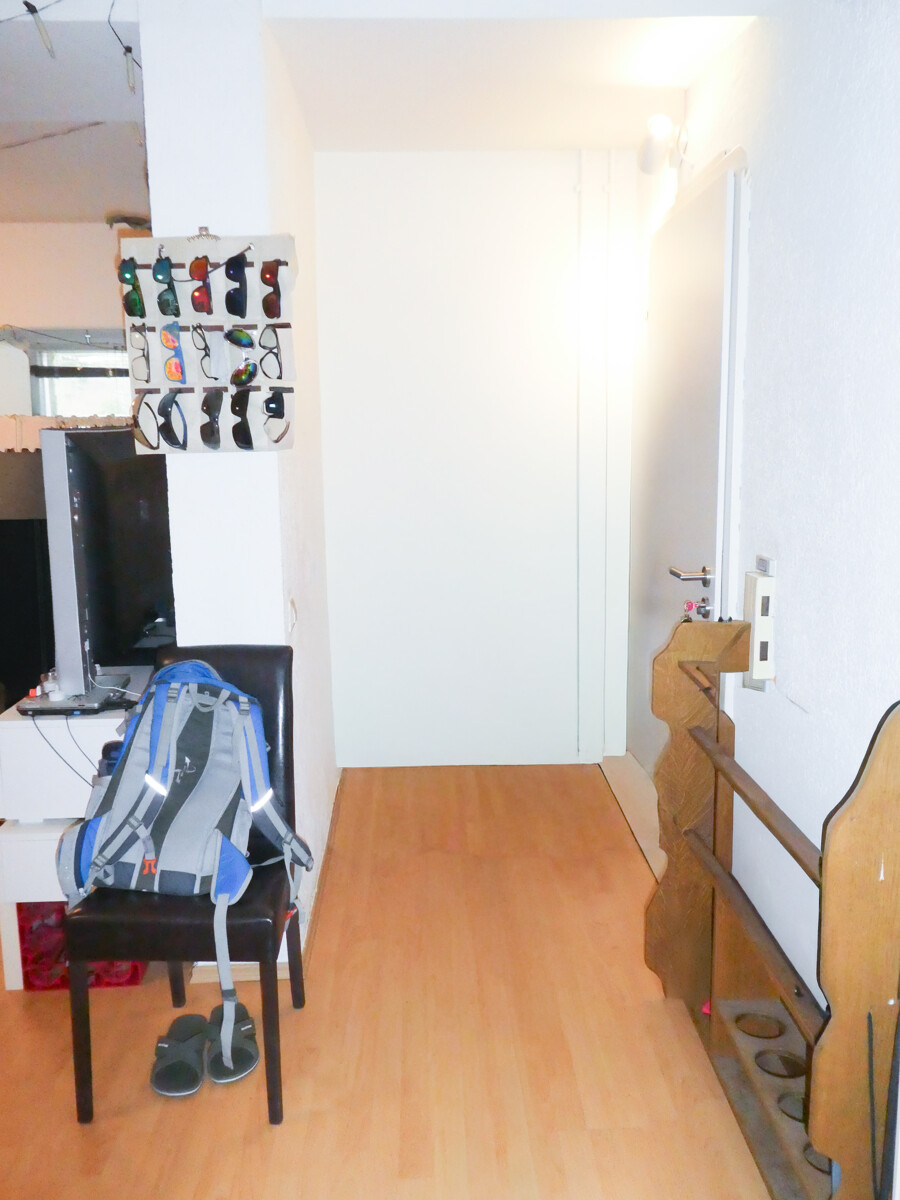 Vom Eingangsbereich aus erschließt sich die Wohnung kompakt und alltagstauglich. Der großzügige Wohn und Schlafbereich ist offen nutzbar und lässt sich flexibel möblieren. Eine große Fensterfläche sorgt für Tageslicht und unterstützt eine angenehme Raumwirkung.