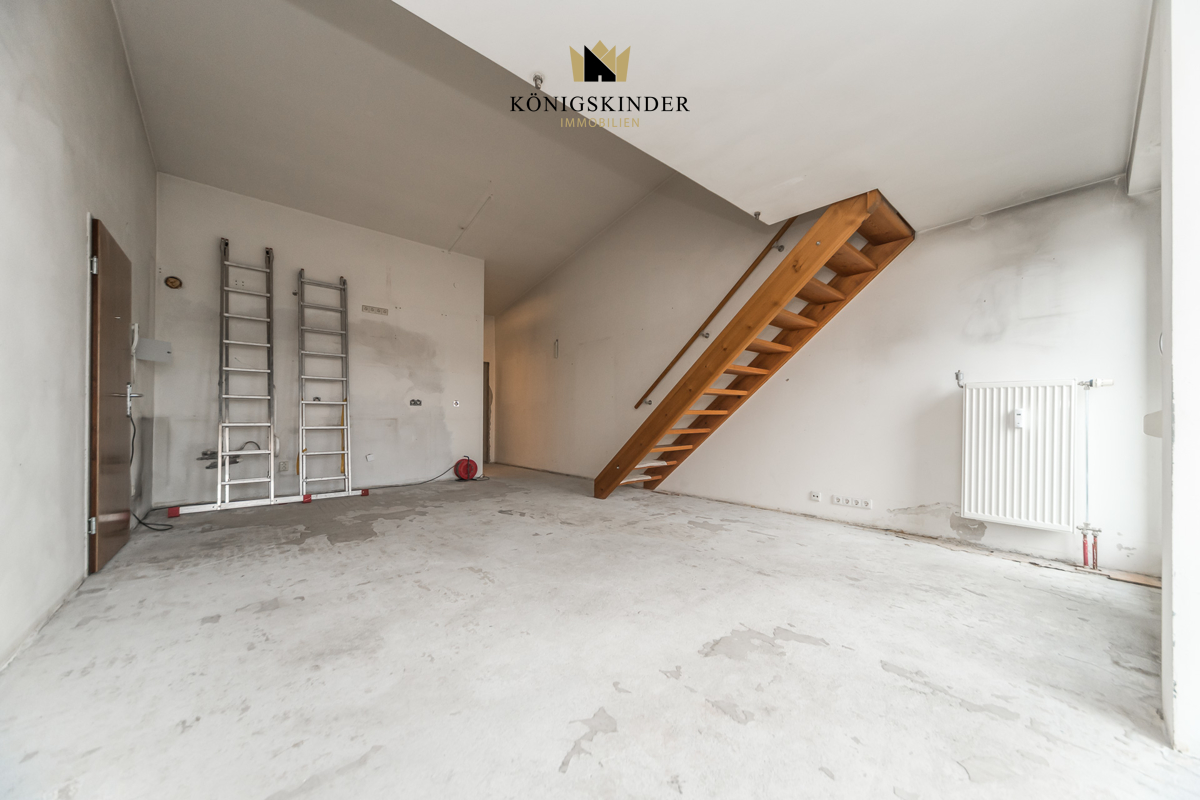 Die lichtdurchflutete Wohnung überzeugt durch ihre offene Raumgestaltung mit Deckenhöhen von bis zu etwa vier Metern, eine Galerie mit flexibler Nutzungsmöglichkeit beispielsweise als Homeoffice, Atelier oder Schlafbereich sowie einen großzügigen Dachbalkon mit Fernblick. Das innenliegende Badezimmer und der Parkettboden wurden im Zuge einer begonnenen Modernisierung bereits zurückgebaut, sodass eine ideale Grundlage besteht, die Wohnung nach eigenen Vorstellungen hochwertig fertigzustellen.