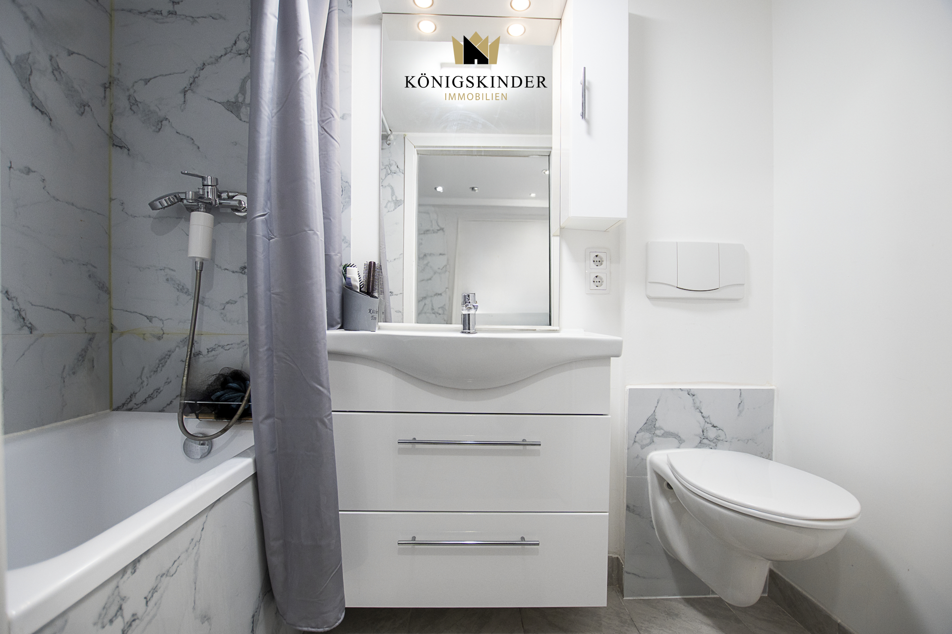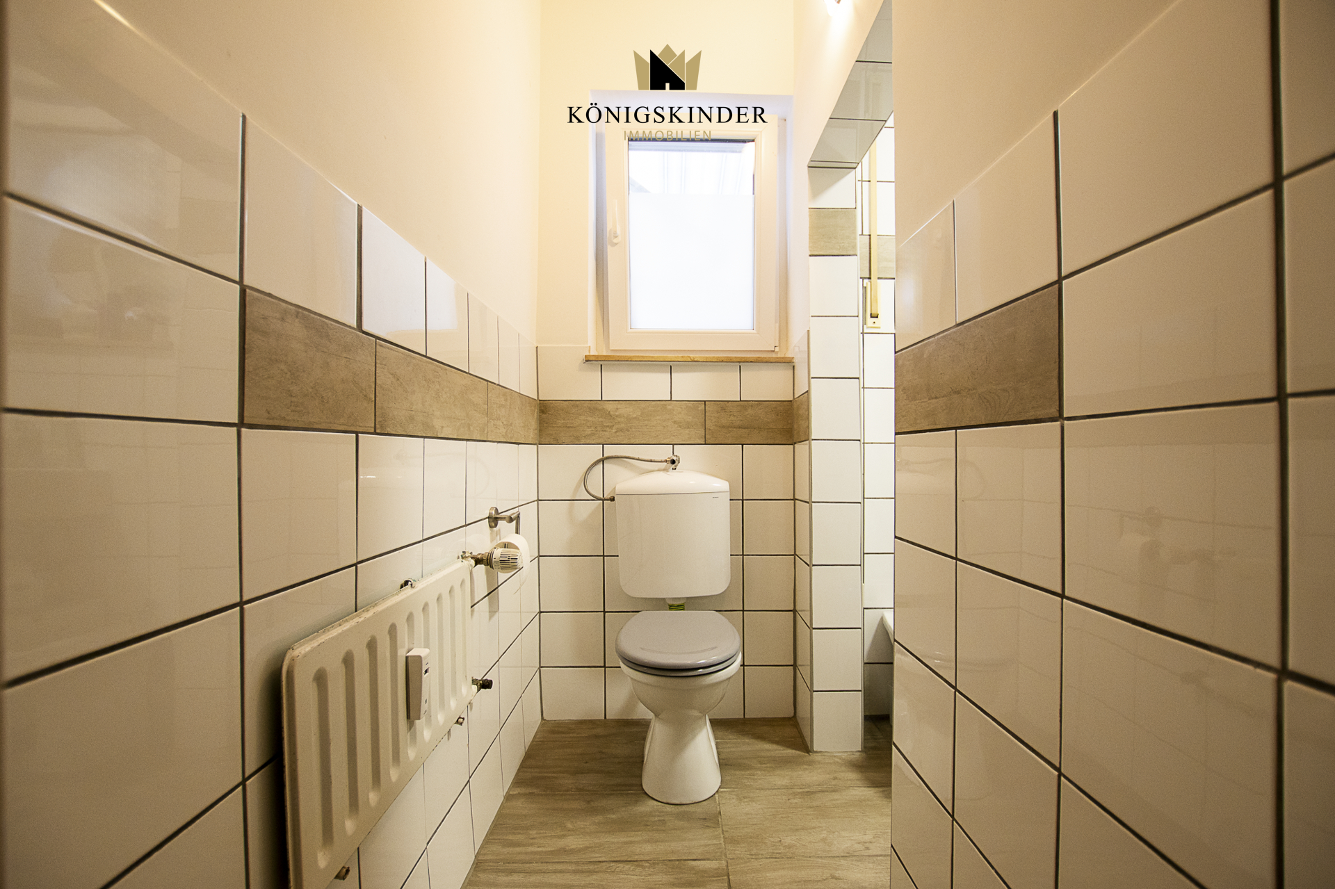 Im Keller wurde ein moderner Wohnraum mit Heizung und neuen Fliesen geschaffen. Dort befindet sich auch ein neues, modernes Badezimmer mit Toilette, Badewanne mit Dusche sowie einem Waschtisch mit Möbeln. Zudem gibt es im Keller einen separaten Bereich, der sich ideal als kleine Küche einrichten lässt.