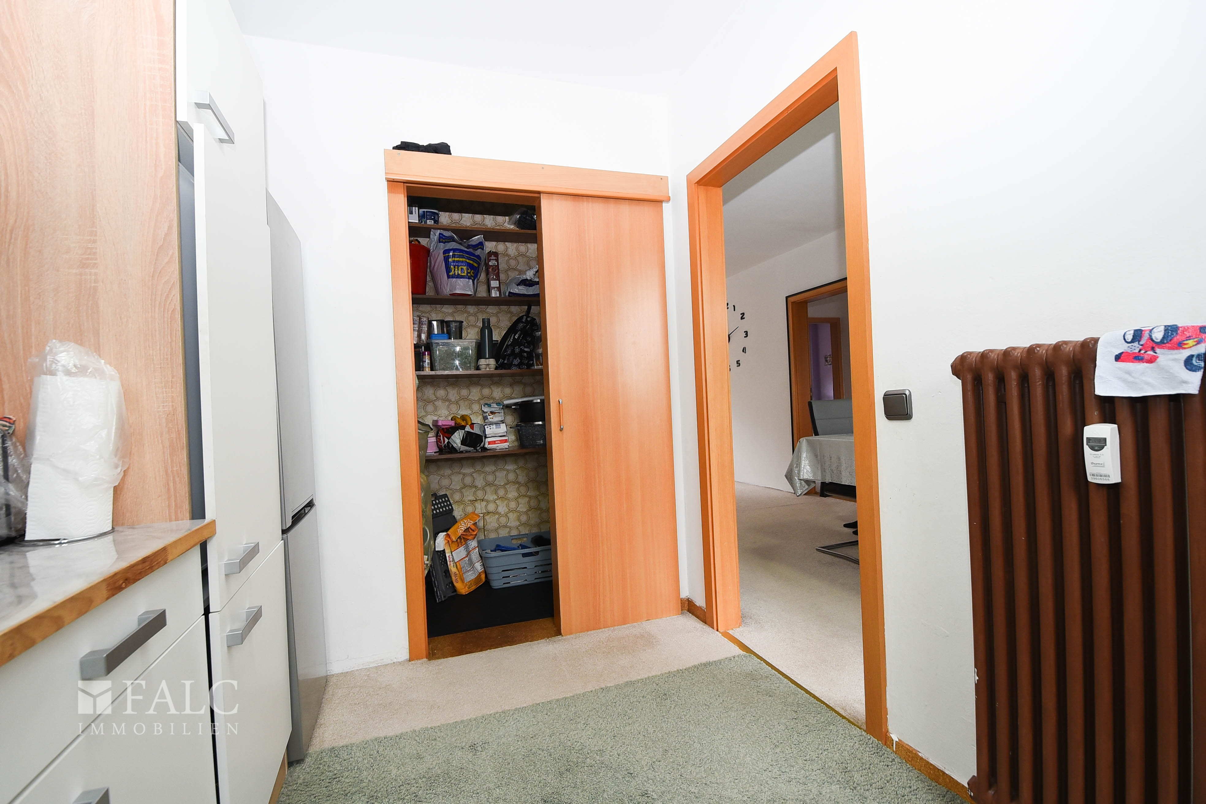 Das Herzstück der Wohnung ist der großzügige Wohn- und Essbereich. Hier entsteht durch die offene Gestaltung ein angenehmes Raumgefühl mit viel Platz für Wohnen und Leben. Direkt angeschlossen befindet sich die Küche, die durch eine separate Vorratskammer sinnvoll ergänzt wird.