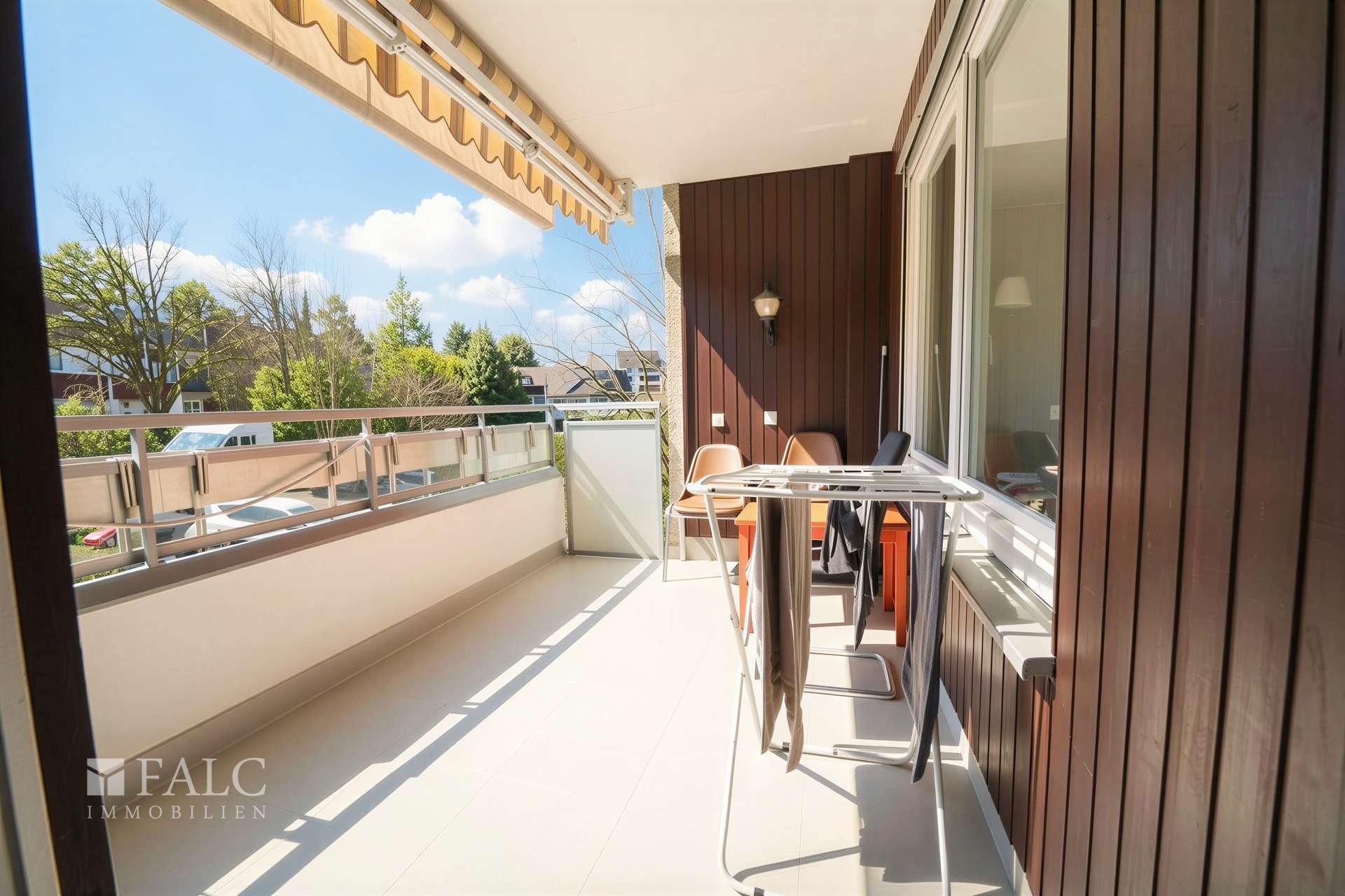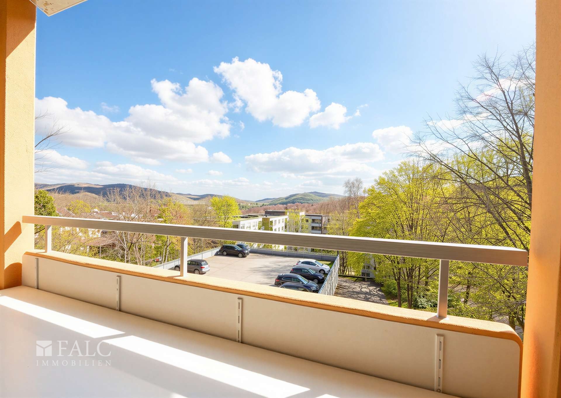 Von hier aus gelangen Sie auf den Balkon mit Blick ins Grüne – ein ruhiger Ort für den Alltag. Die Loggia bietet darüber hinaus einen weiteren geschützten Außenbereich mit Blick in den Taunus. Eine Besonderheit: Die Kombination aus Balkon und Loggia schafft unterschiedliche Aufenthaltsqualitäten – je nach Tageszeit und Wetter.