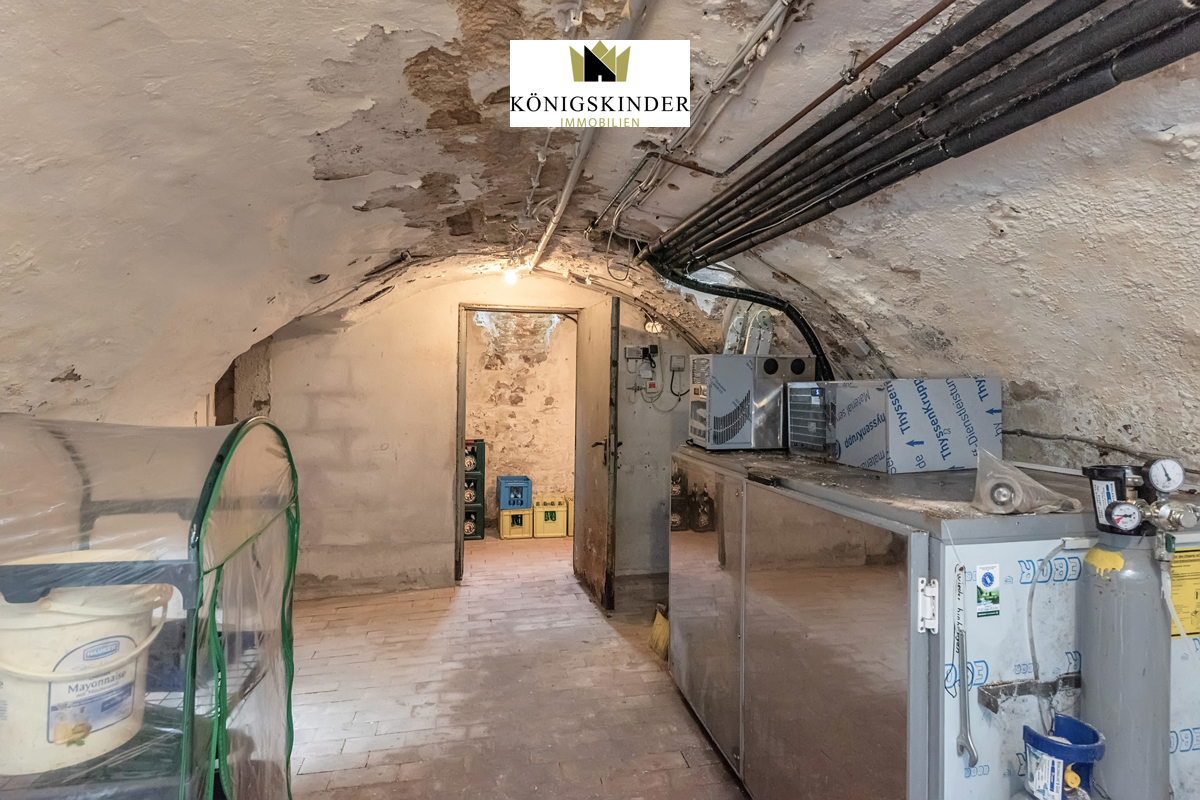 Im geräumigen Untergeschoss stehen umfangreiche Lagerflächen sowie ein charaktervoller Gewölbekeller zur Verfügung, der vielfältig genutzt werden kann.