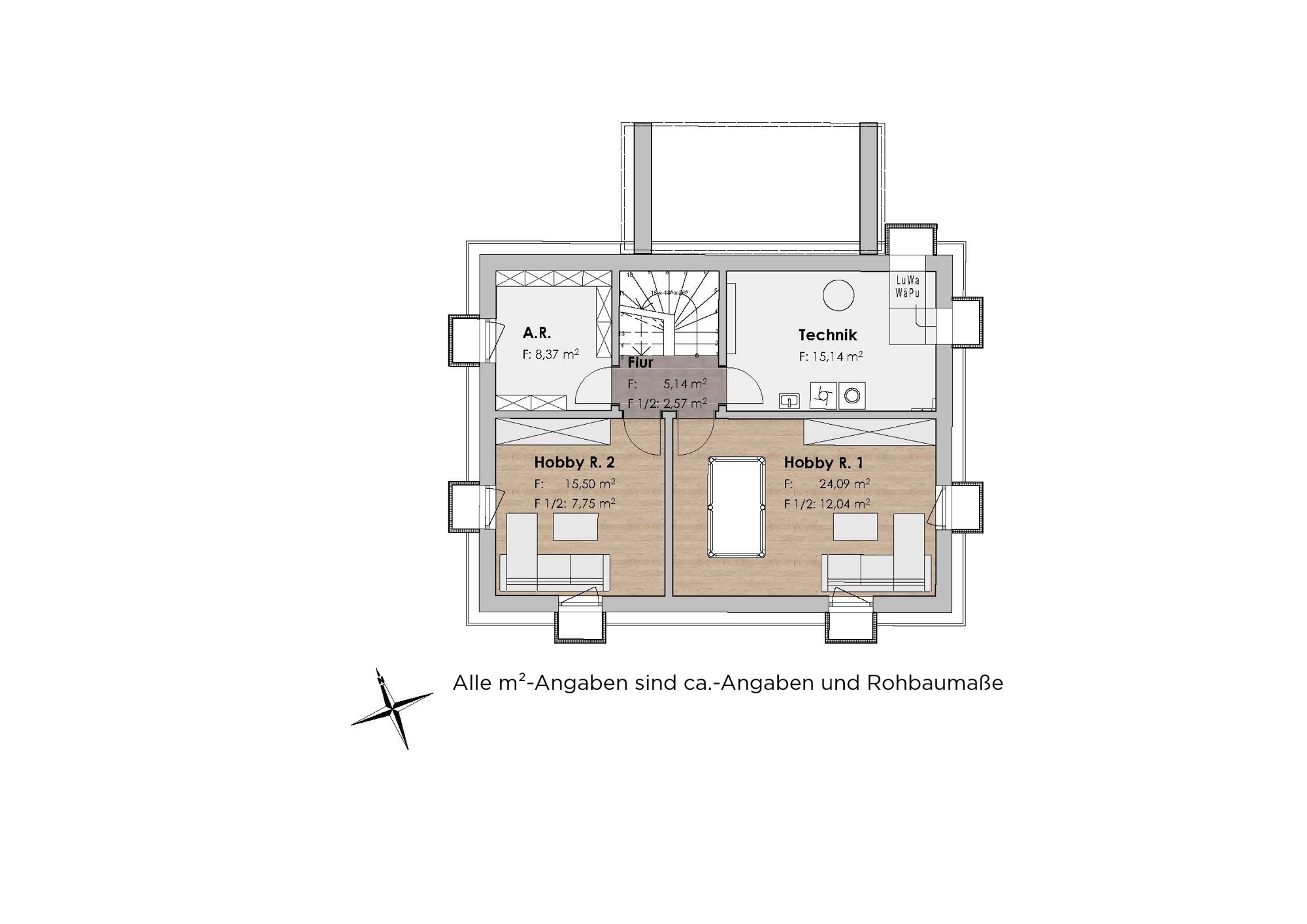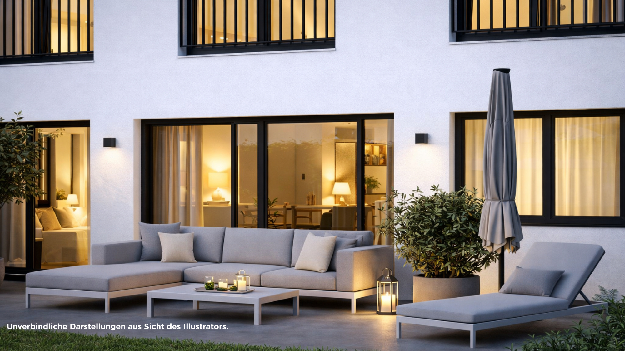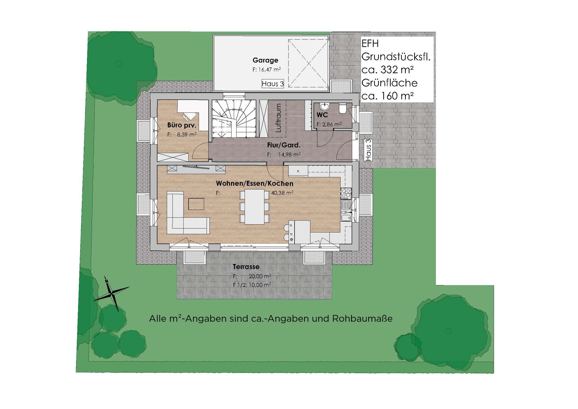 Die dargestellten Grundrisse und Angaben entsprechen dem Stand der Eingabeplanung. Im Rahmen der Ausführungs- und Detailplanung können aufgrund bautechnischer Erfordernisse oder behördlicher Auflagen Änderungen gegenüber dieser Planung möglich sein. Für die Ausstattung ist die Baubeschreibung maßgebend. Dargestellte Möbel und Einbauten sind beispielhaft. Die Grundrisse sind nicht zur Maßnahme für die Möblierung geeignet. Die zeichnerische Darstellung der Perspektiven und Fassaden sowie deren Farbgestaltung ebenso wie die Aussenvisuaisierungen und Innenvisualisierungen geben die Sicht des Illustrators wieder und sind deshalb nicht verbindlich. Die Abbildungen zeigen teilweise Sonderausstattungen, die entsprechend der Baubeschreibung nur nach vorheriger Absprache gegen Mehrkosten erhältlich sind.