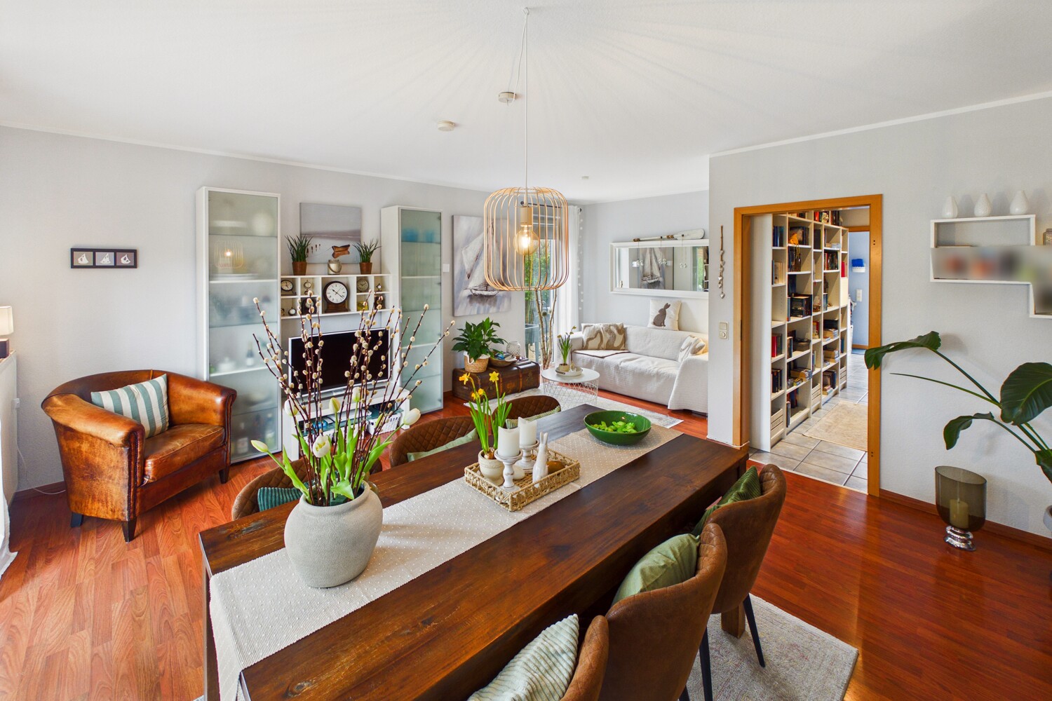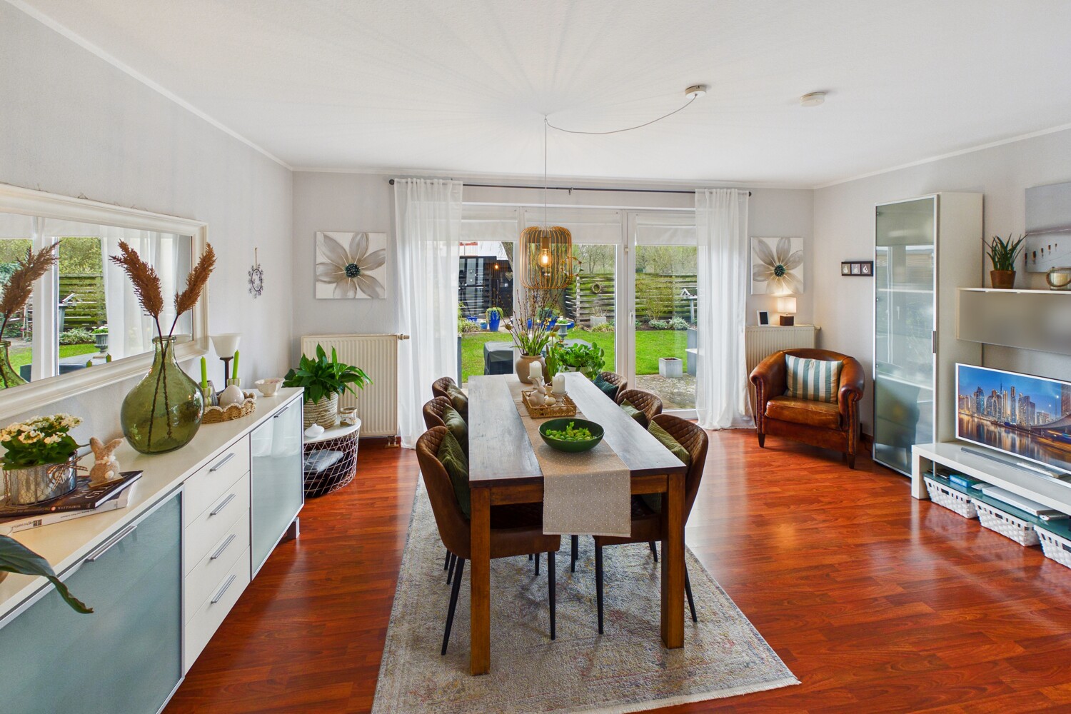 Der Wohnbereich überzeugt durch seine angenehme Größe und Helligkeit. Von hier aus gelangen Sie direkt auf die Terrasse und in den schön angelegten Garten, der zu entspannten Stunden im Freien einlädt.
