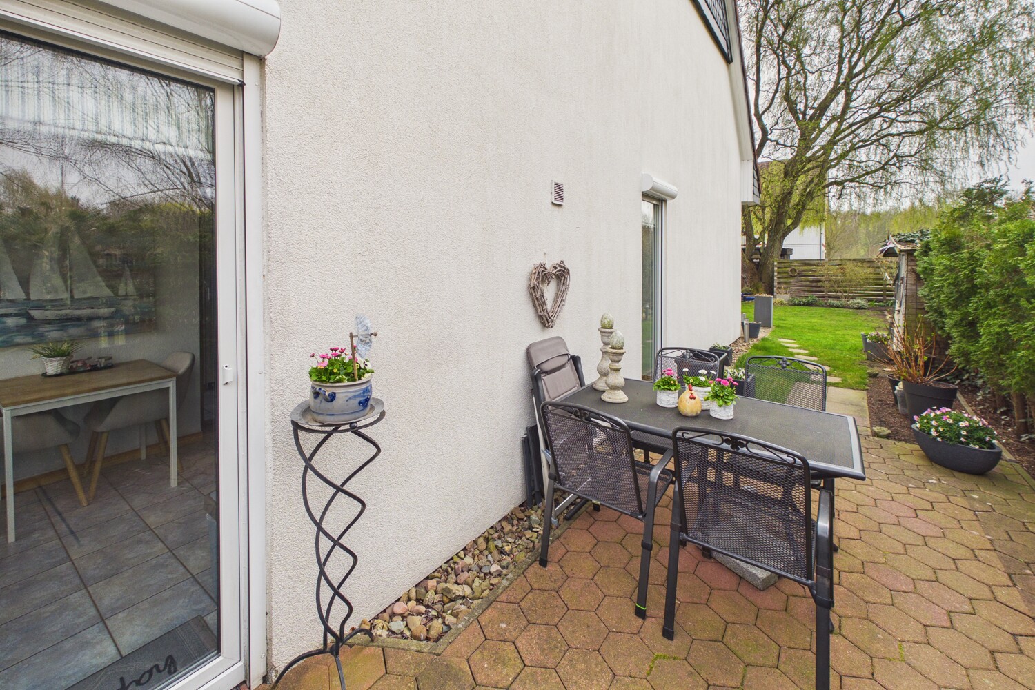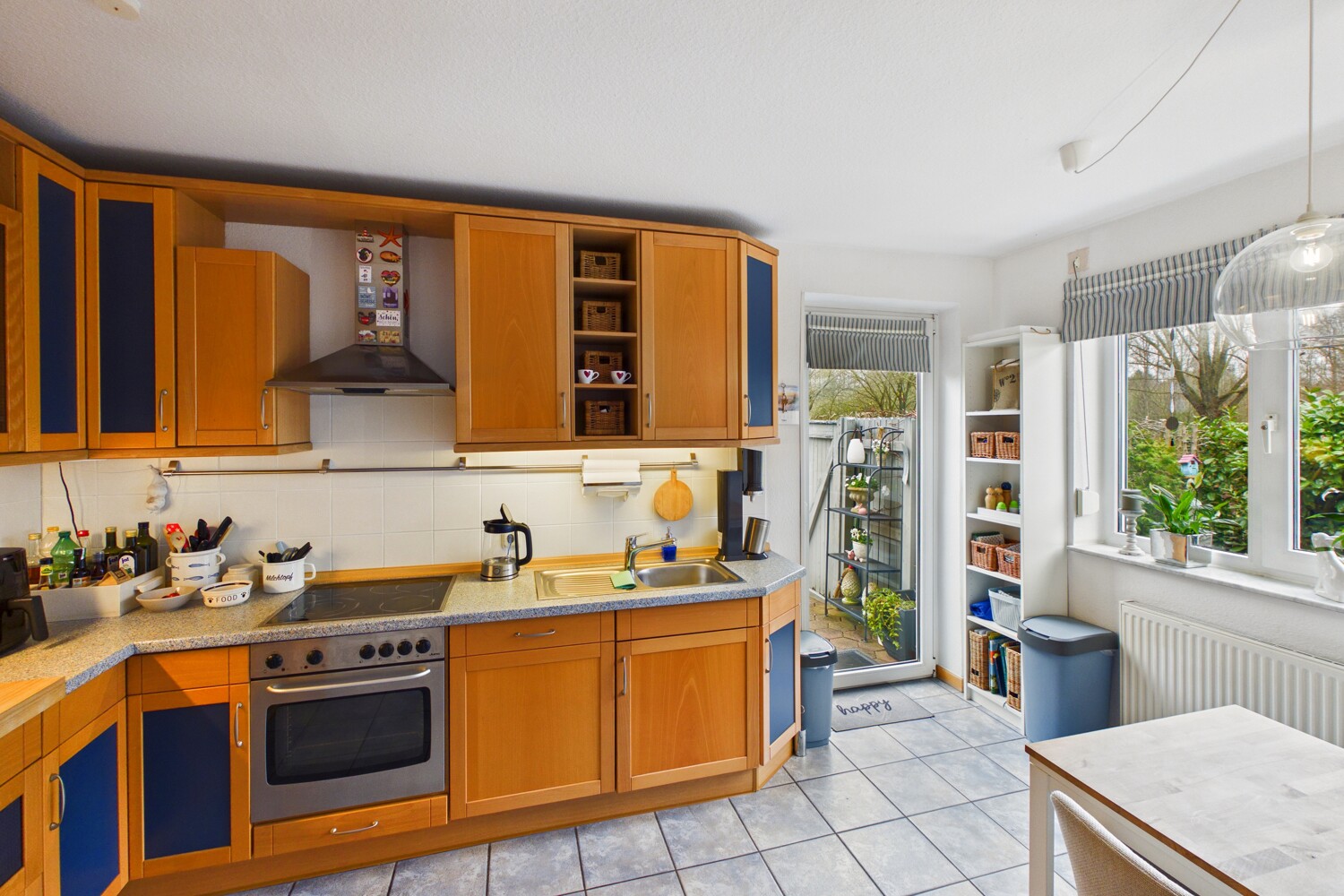 Die Ausstattung des Hauses präsentiert sich in einem guten und gepflegten Zustand und ermöglicht einen komfortablen Einzug ohne größeren Aufwand. Die vorhandene Einbauküche fügt sich funktional in den Grundriss ein und bietet ausreichend Platz zum Kochen und Arbeiten. Von hier aus besteht zudem ein separater Ausgang zur zweiten Terrasse und in den Garten – ideal für kurze Wege ins Freie oder für gesellige Stunden im Außenbereich.