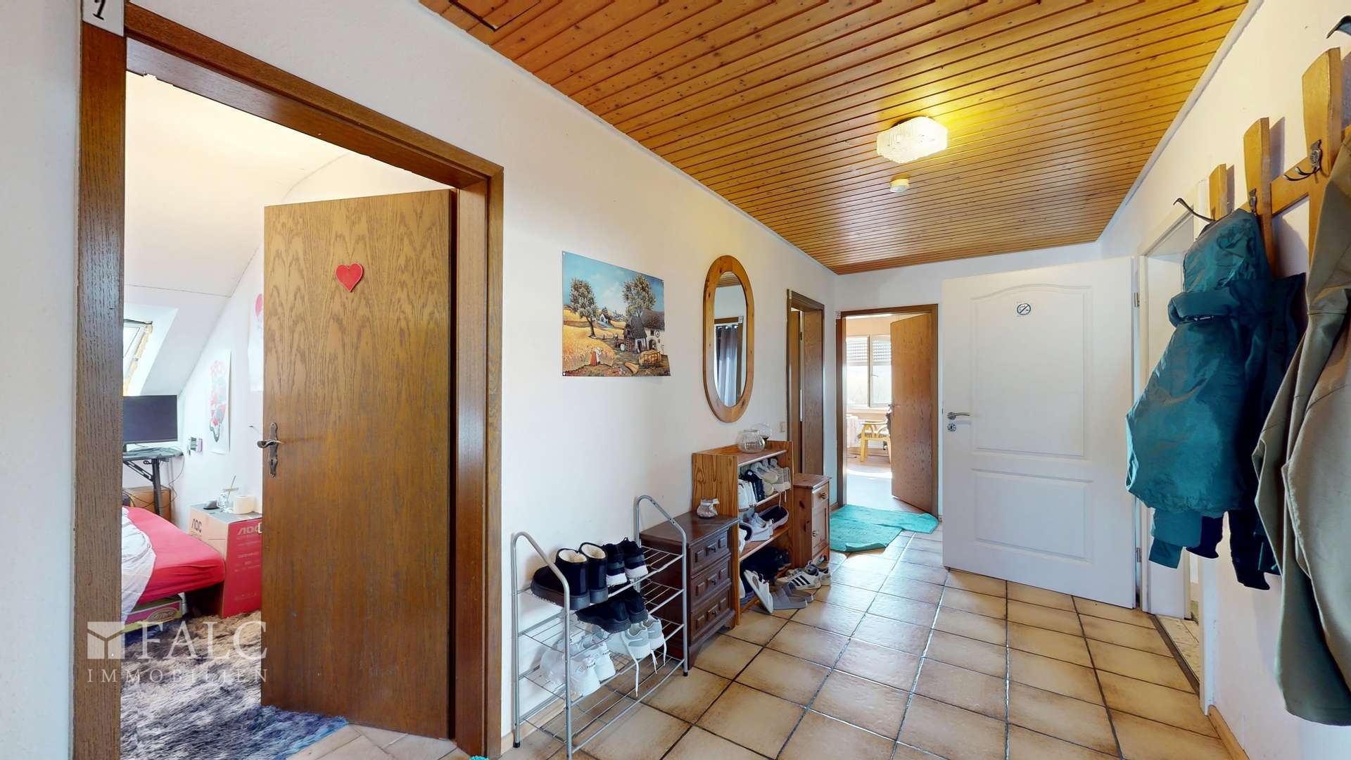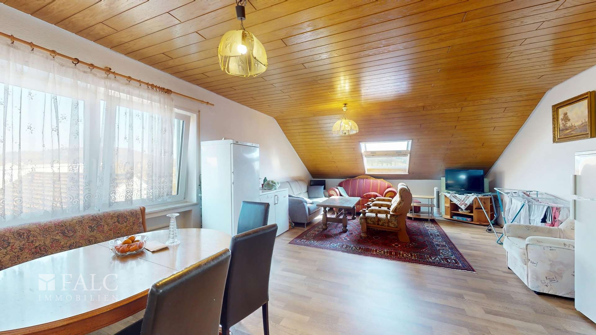 Im Dachgeschoss stehen ein kombinierter Essen und Wohnen Bereich sowie eine Küche zur Verfügung. Dazu kommen ebenso drei weitere Zimmer, ein Bad und ein Abstellraum, wodurch diese Etage sowohl für gemeinsames Wohnen als auch für Rückzug und Stauraum klar strukturiert bleibt.