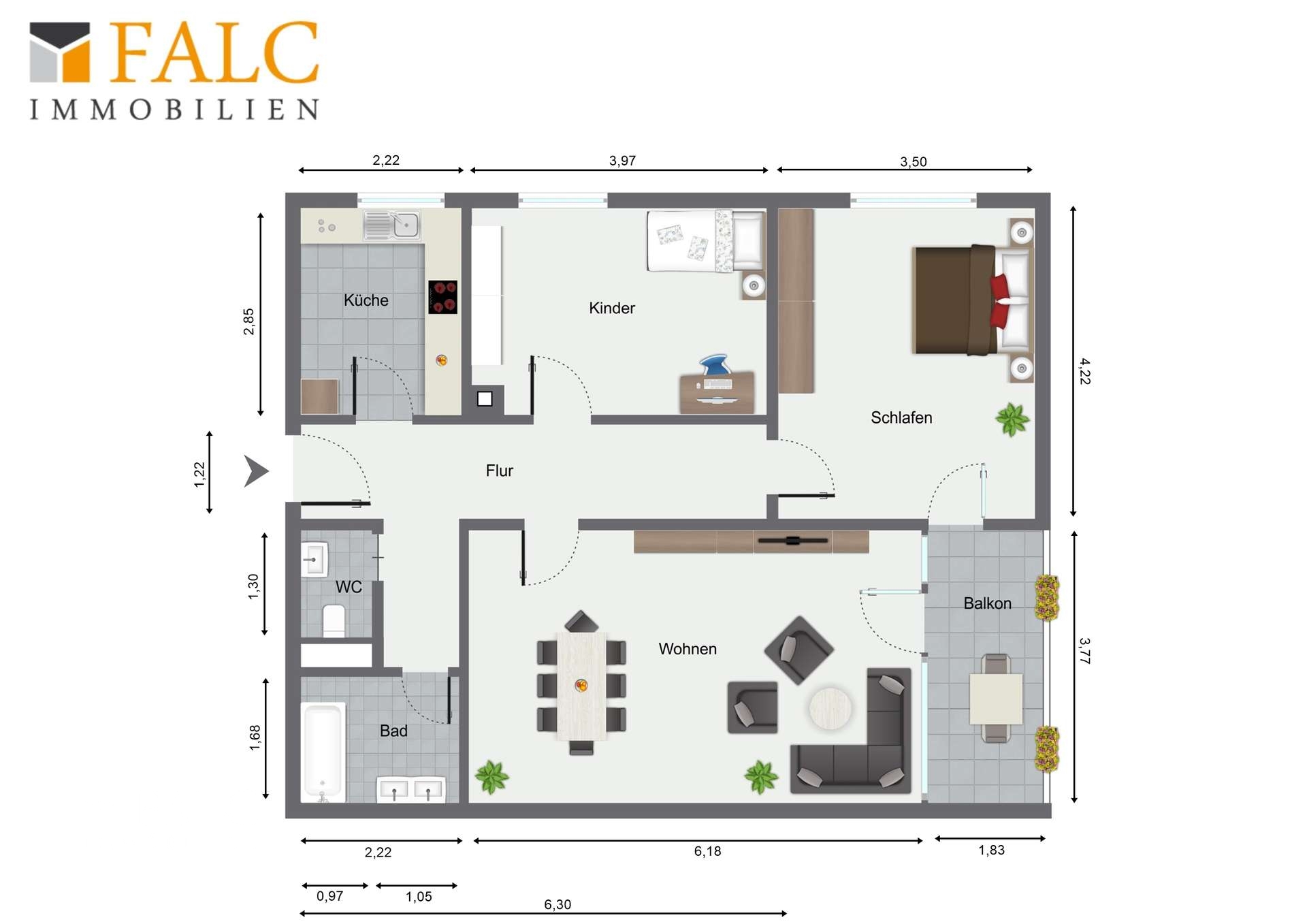 Bitte beachten Sie, dass wir aus Rücksicht auf die Privatsphäre der aktuellen Mieter die Möblierung der einzelnen Räume visualisiert haben. Dies soll Ihnen dabei helfen, sich besser vorstellen zu können, wie die Wohnung nach einer Neumöblierung eingerichtet aussehen kann.