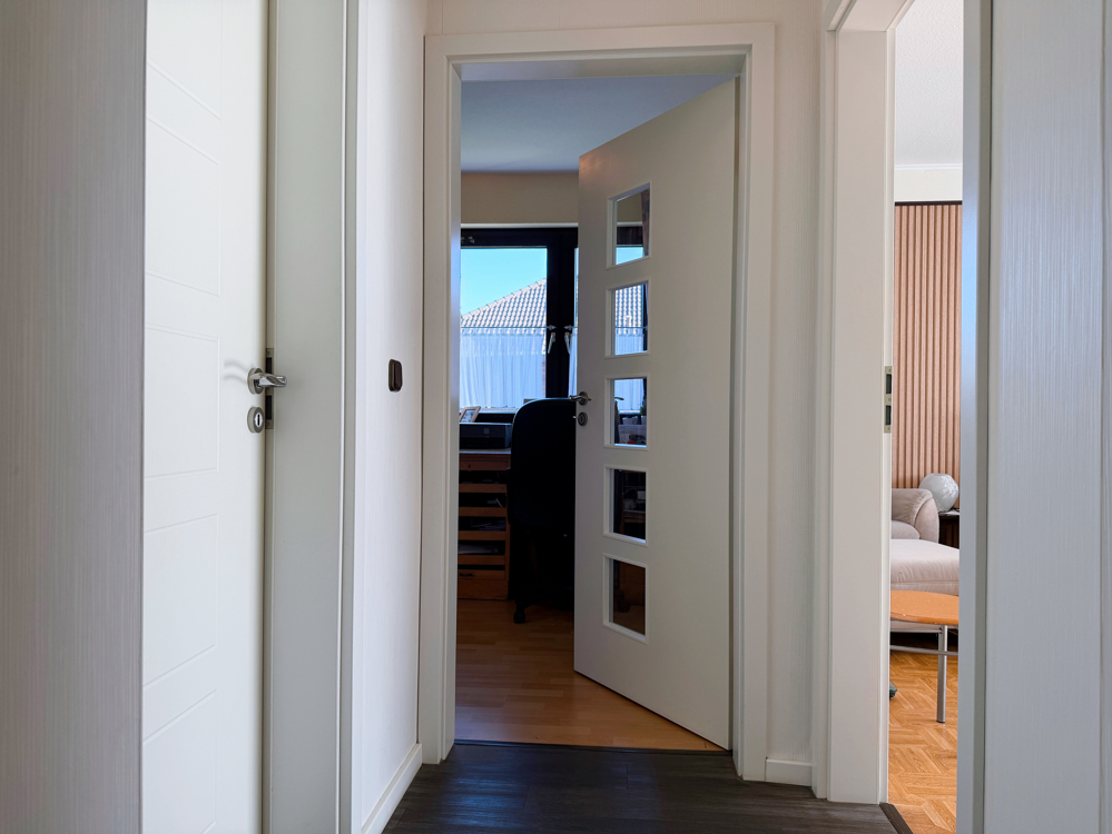 - Flur: ca. 13,3 m2 - Gäste-WC: ca. 1,45 m2 - Wohn/Esszimmer: ca. 23 m2 + 9,2 m2=32,2 m2 - Küche: ca. 11,1 m2 - Büro: ca. 11 m2 - Bad: ca. 7 m2 - Schlafen : ca. 18,2 m2 - Sommergarten: ca. 20,7 m2 (davon 50% zur Wohnfläche=ca. 10 m2)