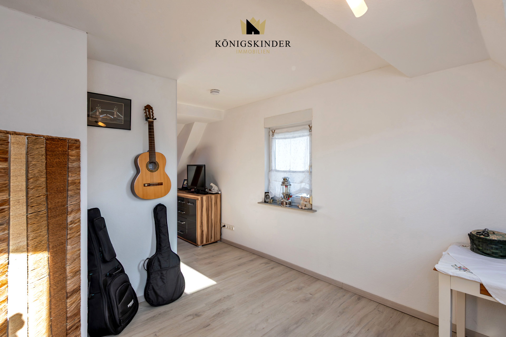 Über die markante Holztreppe gelangen Sie ins Obergeschoss, wo zwei großzügige Zimmer zur Verfügung stehen, die flexibel als Kinder-, Gäste- oder Arbeitszimmer genutzt werden können. Helle Velux-Dachfenster mit integrierter Beschattung sorgen hier für viel Tageslicht und ein angenehmes Raumklima.