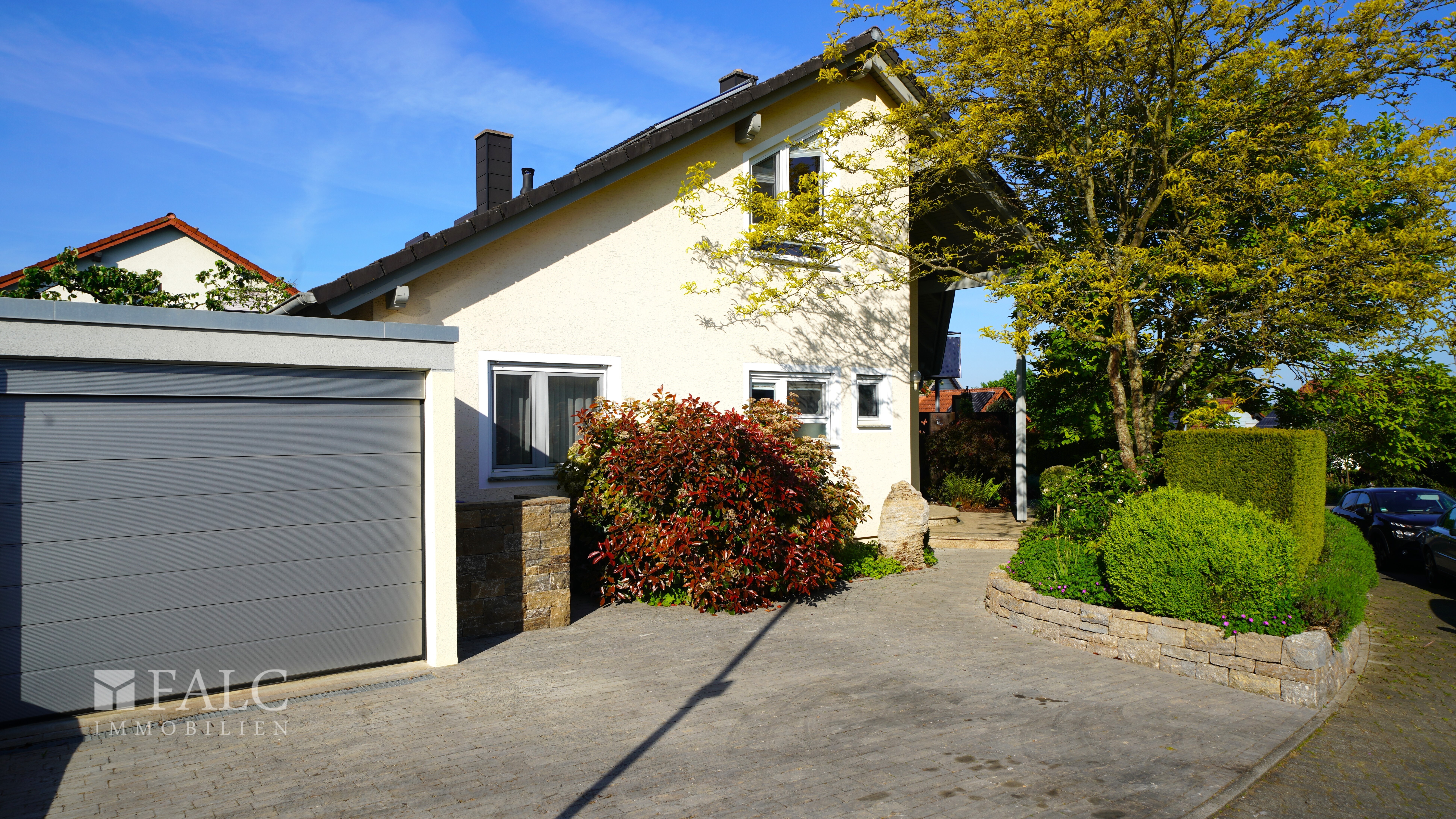 Willkommen in einem wahren Paradies, das sich Ihnen mit einer charmanten Einfahrt aus fränkischem Naturmuschelkalk präsentiert. Diese führt Sie sanft zum Eingang des Wohnjuwels und lädt Sie ein, die hohe Qualität der Materialien zu entdecken, die sich auch an den Seiten des Hauses fortsetzen und direkt in den malerischen Garten übergehen.