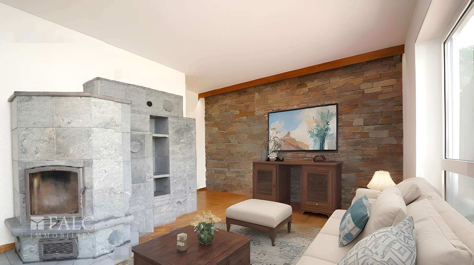 Im zum Wohnbereich angrenzenden Raum sorgt der Speckstein-Kaminofen, der die Wärme nach dem Ausschalten für weitere zwei Tage hält, für behagliche Gemütlichkeit. Dank der bodentiefen Fenster besitzt dieser Raum einen Wintergartencharakter und eignet sich ideal als Lesezimmer oder als weiterer Ort zum Entspannen – der perfekte Lieblingsplatz für kalte Tage.