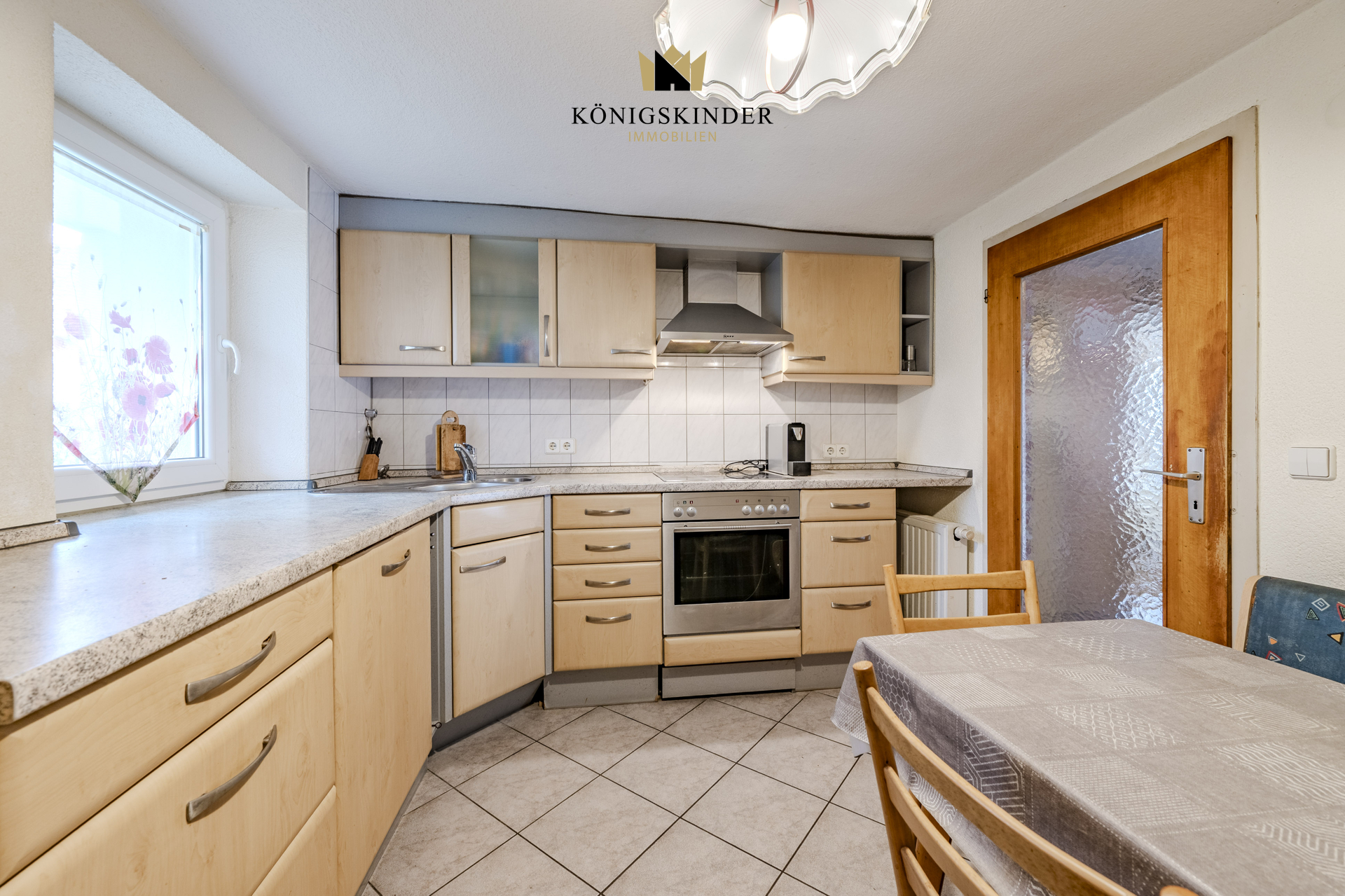 Der Weg ins Haus führt durch eine klassische Eingangstür direkt ins Erdgeschoss. Hier schlägt das Herz des Hauses: Die Küche mit Essplatz und das helle Wohnzimmer orientieren sich voll zur Sonnenseite Richtung Garten. Das Tageslichtbad wurde 2006 erneuert und ist, genau wie das separate Gäste-WC, funktional und freundlich gestaltet.