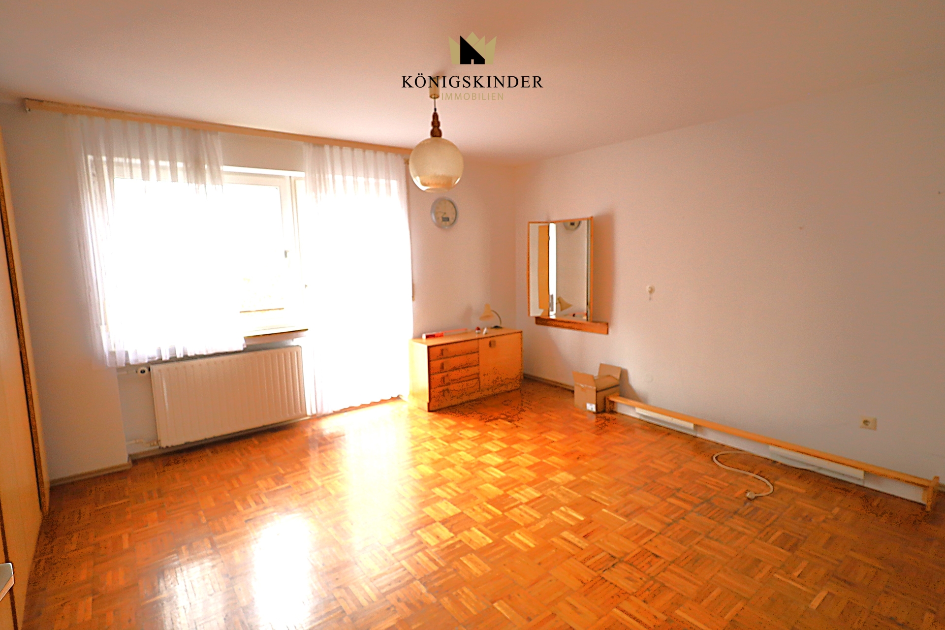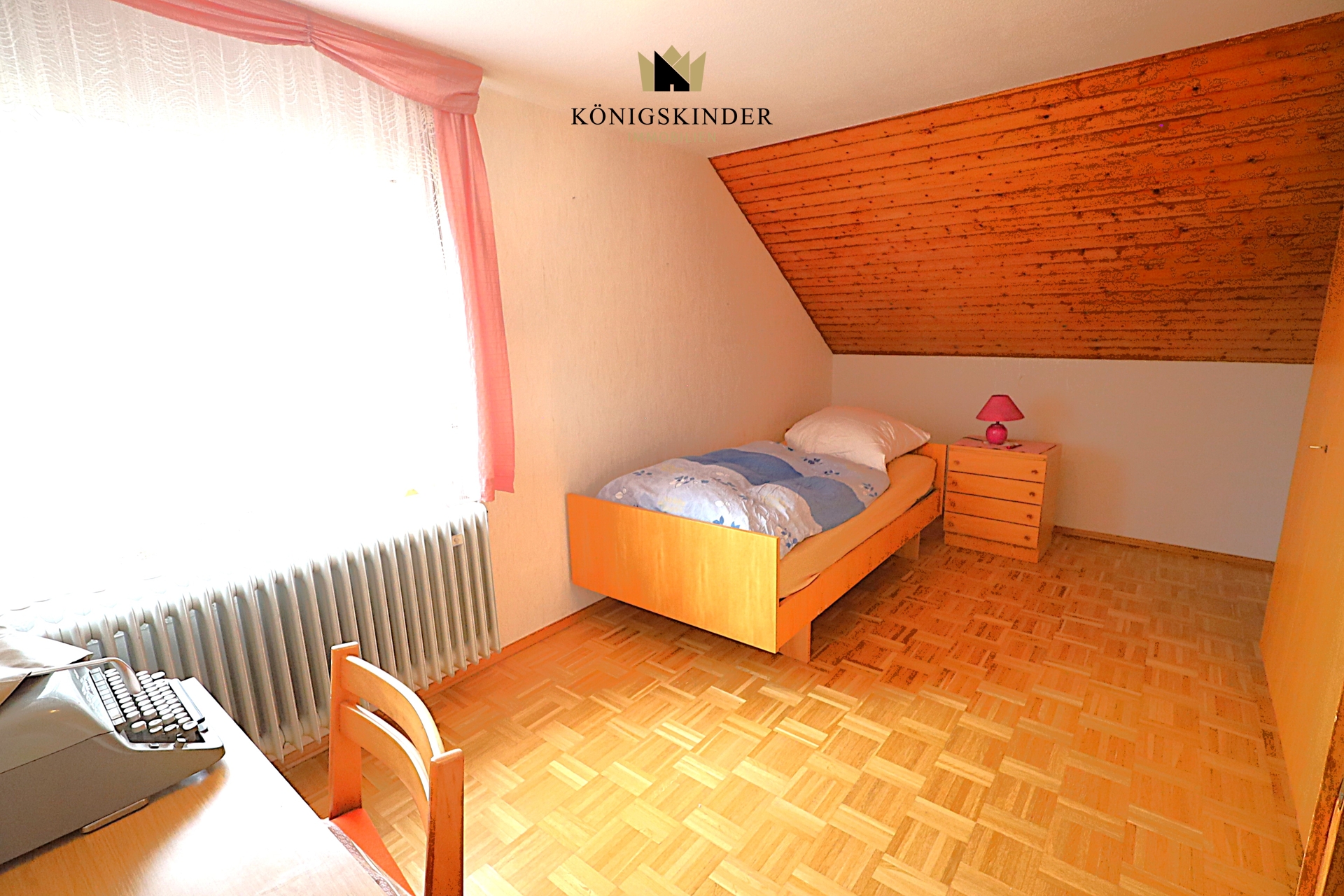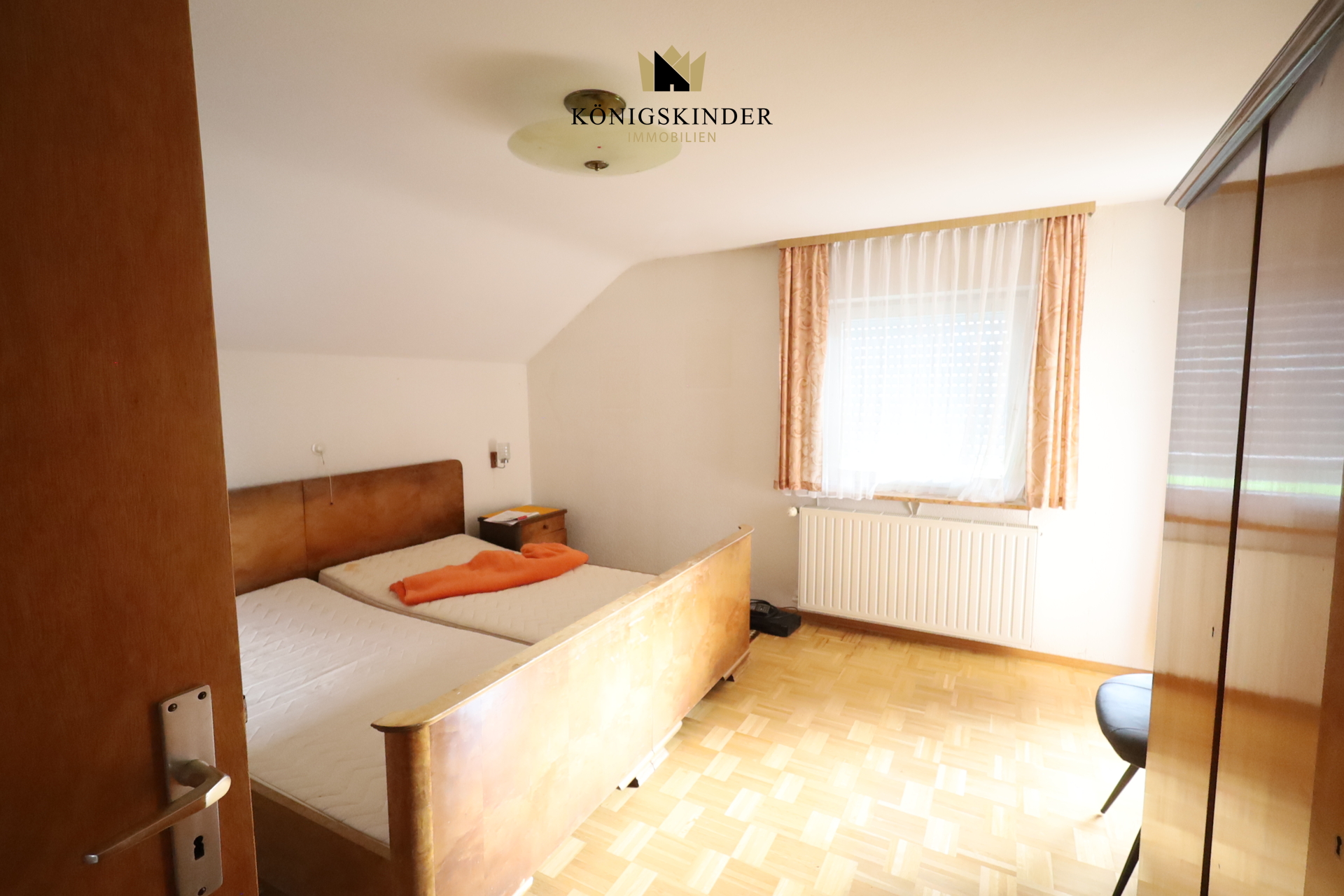 Im Obergeschoss stehen Ihnen vier Zimmer, eine Küche und ein Bad zur Verfügung. Zwei Zimmer haben Ausgang zum überdachten Süd-Balkon.