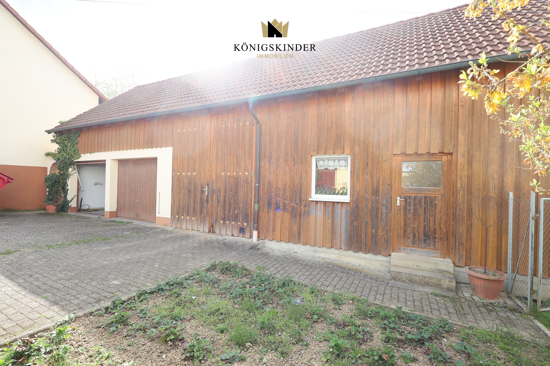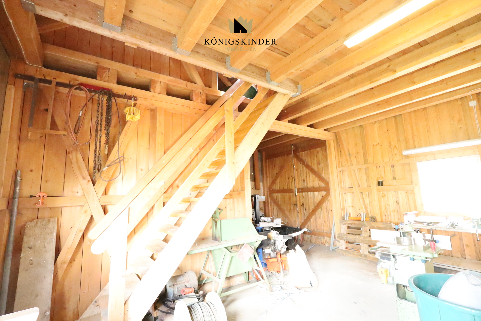 Das Nebengebäude mit der Doppelgarage ist in bestem Bau- und Pflegezustand. Die Scheune ist ein typischer Fachwerkbau und wurde im Jahr 2000 errichtet und zum Teil über die Doppelgarage gestülpt.