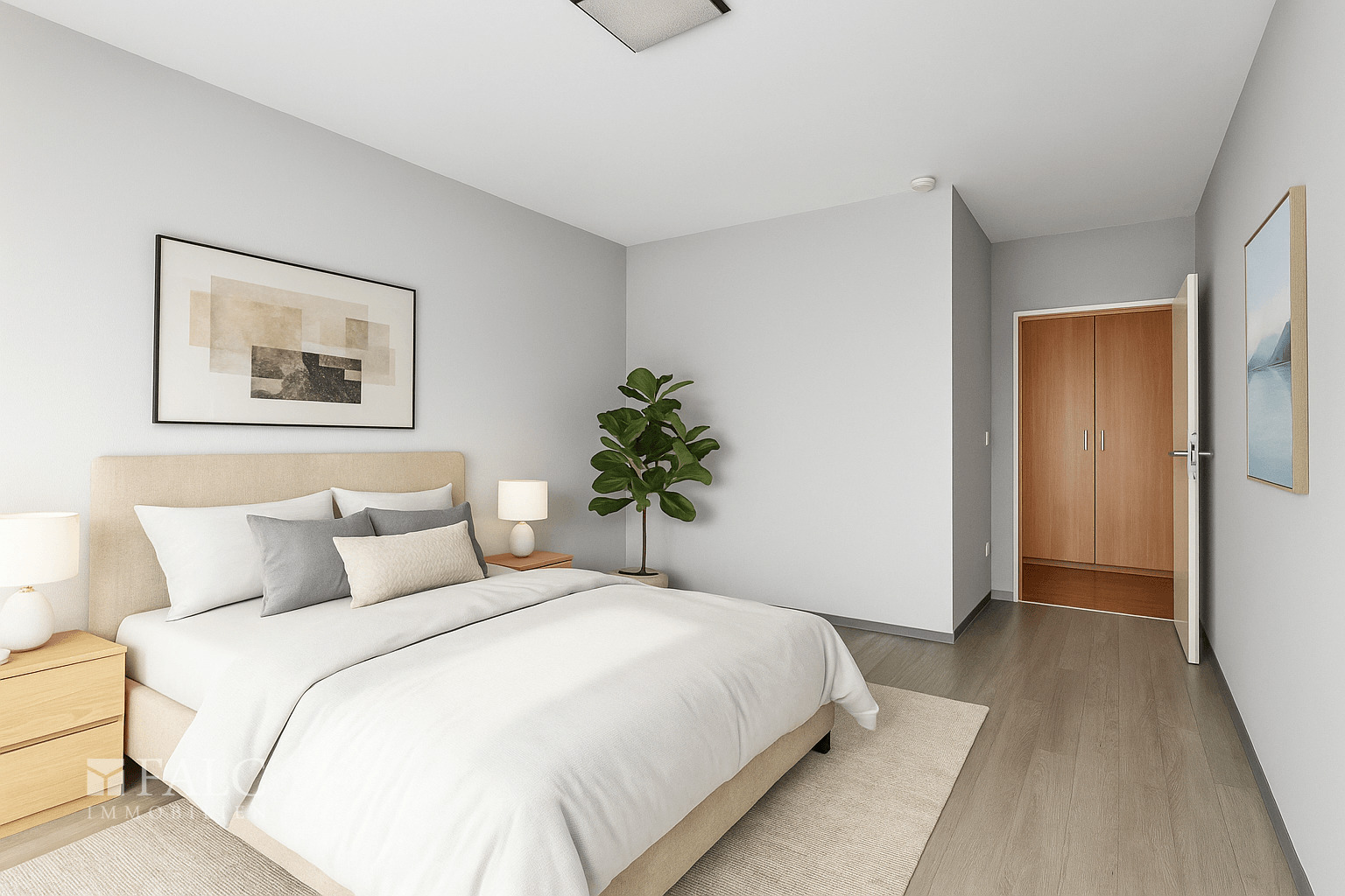 Am Ende des Flurs liegt das Hauptschlafzimmer, mit genug Platz für ein Doppelbett, einen großen Kleiderschrank und weitere Möbelstücke. Von hier haben Sie Zugang zum zweiten Balkon, der nach Norden ausgerichtet ist und sich ideal für die kühlen Morgenstunden eignet.