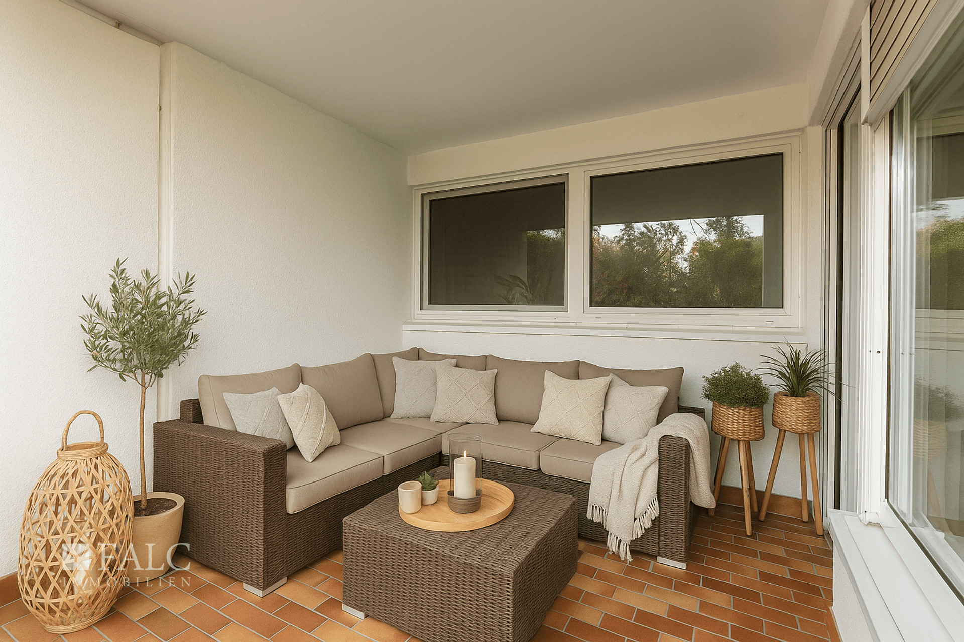 Geradeaus gelangen Sie auf der linken Seite in das helle und großzügige Wohnzimmer, das den Mittelpunkt der Wohnung bildet. Die großen Fenster lassen den Raum mit Tageslicht durchfluten und verleihen ihm eine einladende Atmosphäre. Von hier aus gelangen Sie auf die großzügige, überdachte Loggia, die einen herrlichen Blick in den grünen Innenhofpark bietet und dank der Überdachung auch in der kühleren Jahreszeit zum entspannten Verweilen im Freien einlädt.