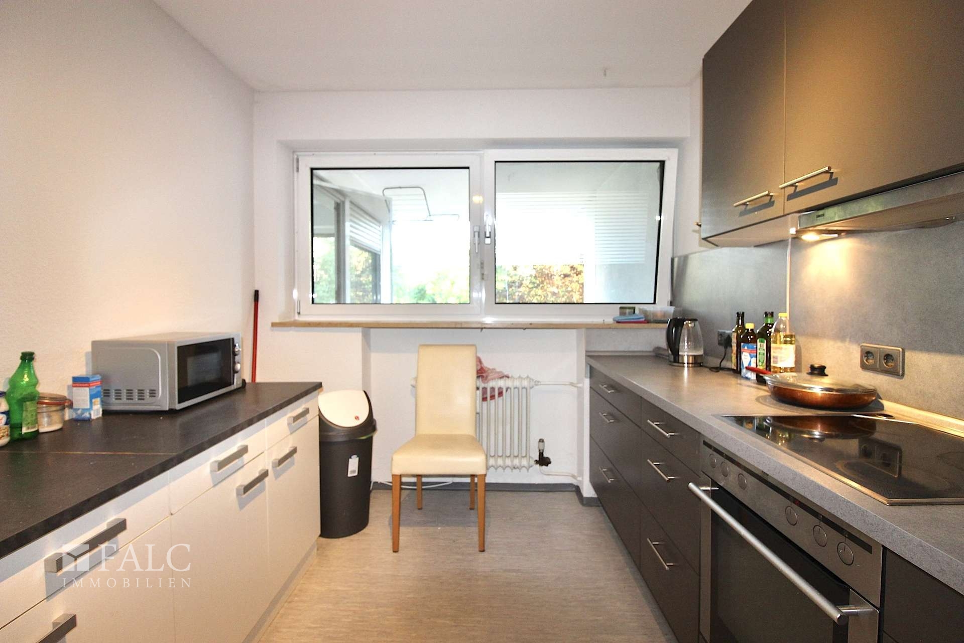 Angrenzend an das Wohnzimmer befindet sich die separate Küche. Sie ist modern und funktional gestaltet, bietet reichlich Arbeitsfläche sowie Platz für alle notwendigen Elektrogeräte und ausreichend Stauraum.
