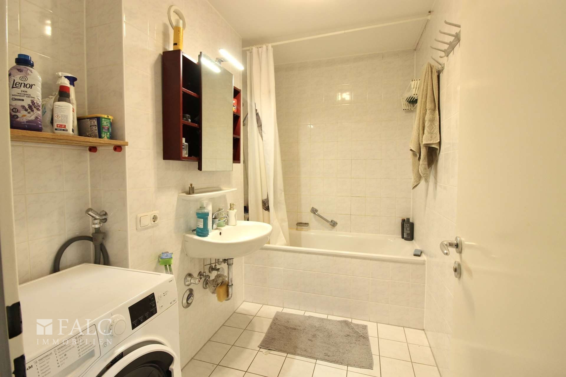Zwischen Küche und Hauptschlafzimmer liegt das zeitlos geflieste Badezimmer mit Badewanne und Waschmaschinenanschluss. Hier ist genügend Stellfläche für Badmöbel und Ablagen vorhanden.