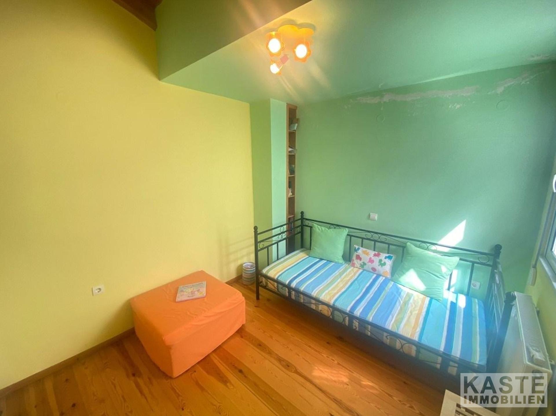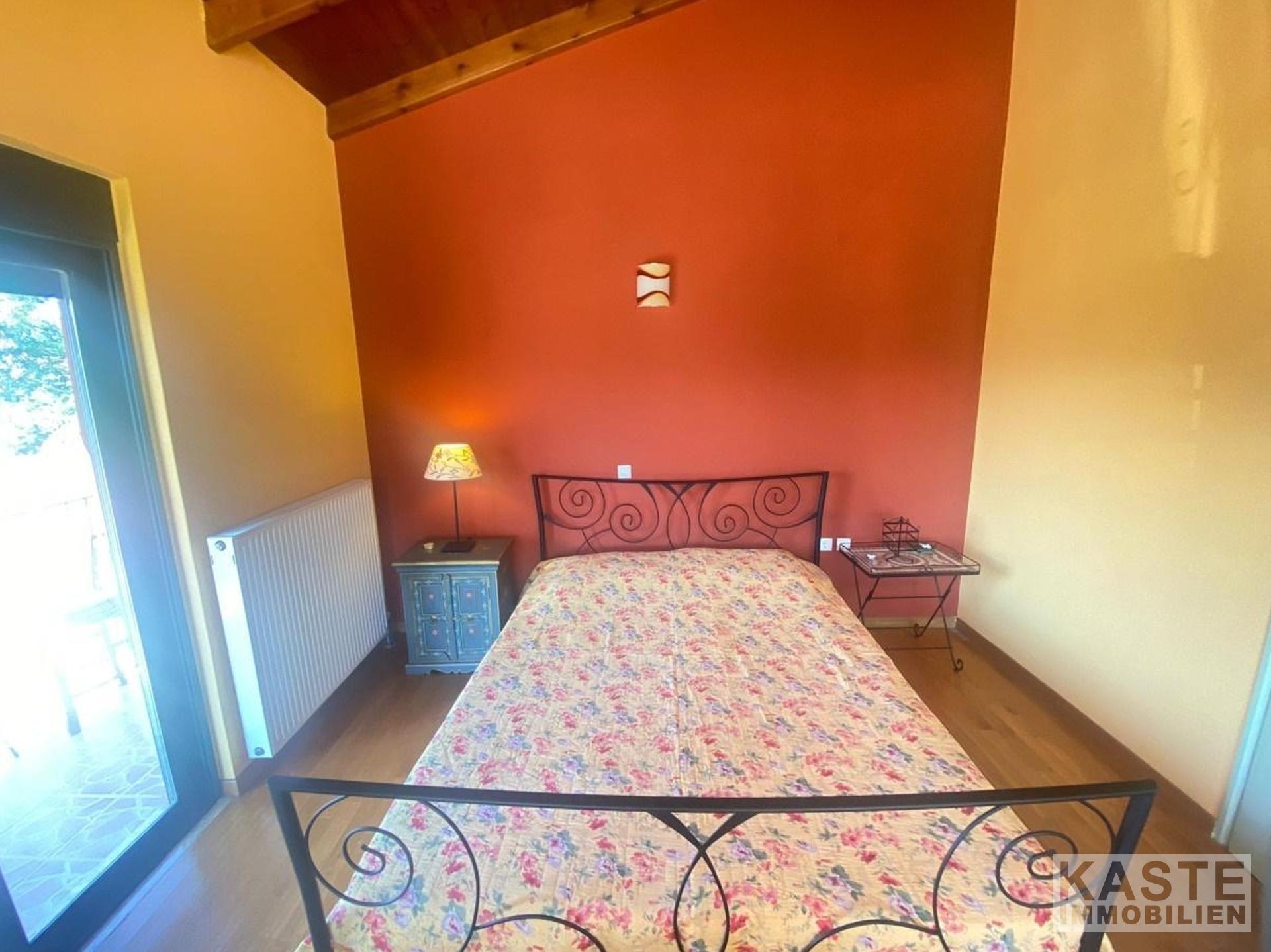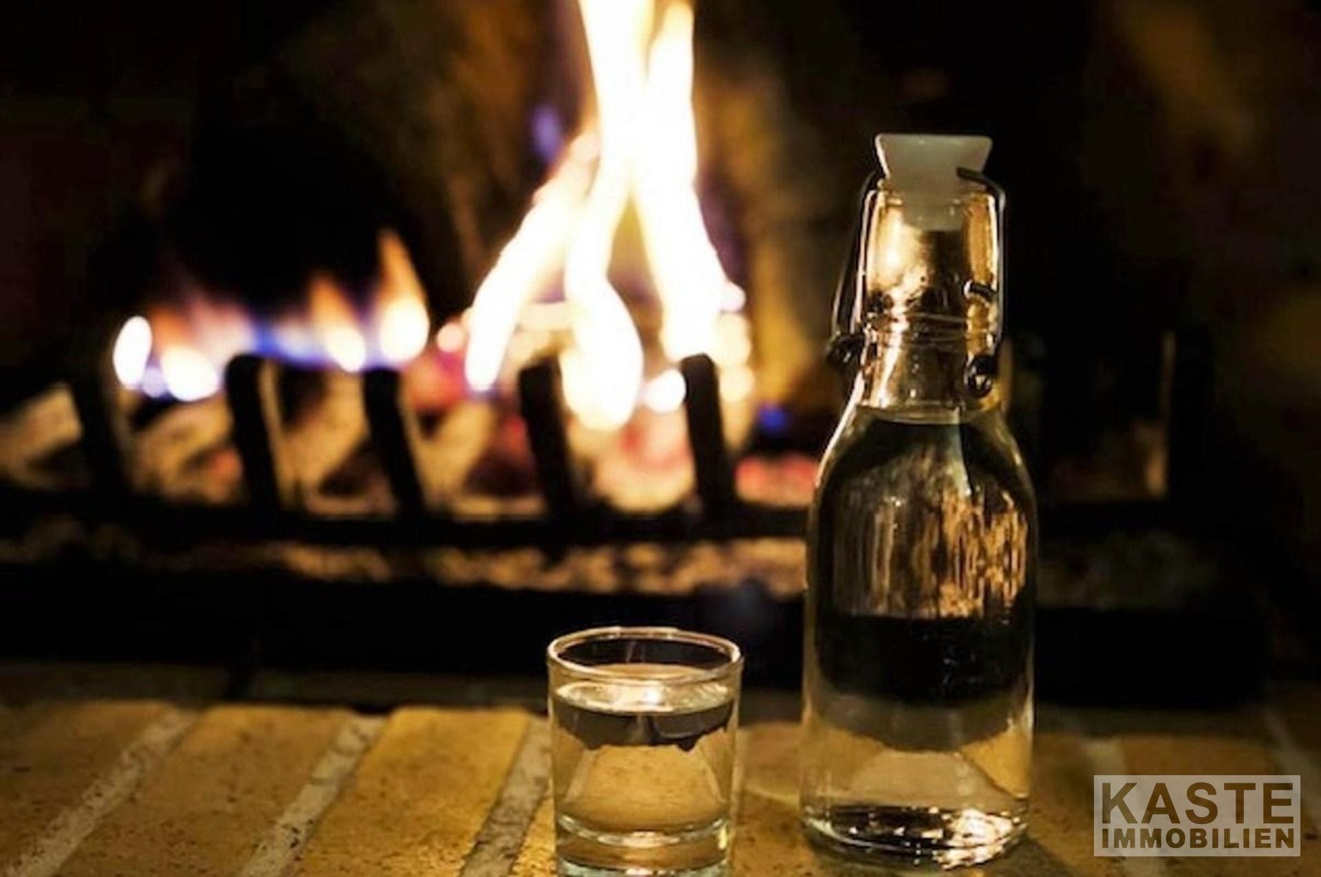 Im Erdgeschoss gelangen Sie durch den Eingang in das Wohnzimmer mit Kamin und in die offene, voll ausgestattete Küche. Neben der Küche gibt es einen separaten Eingang mit kleinem Balkon.