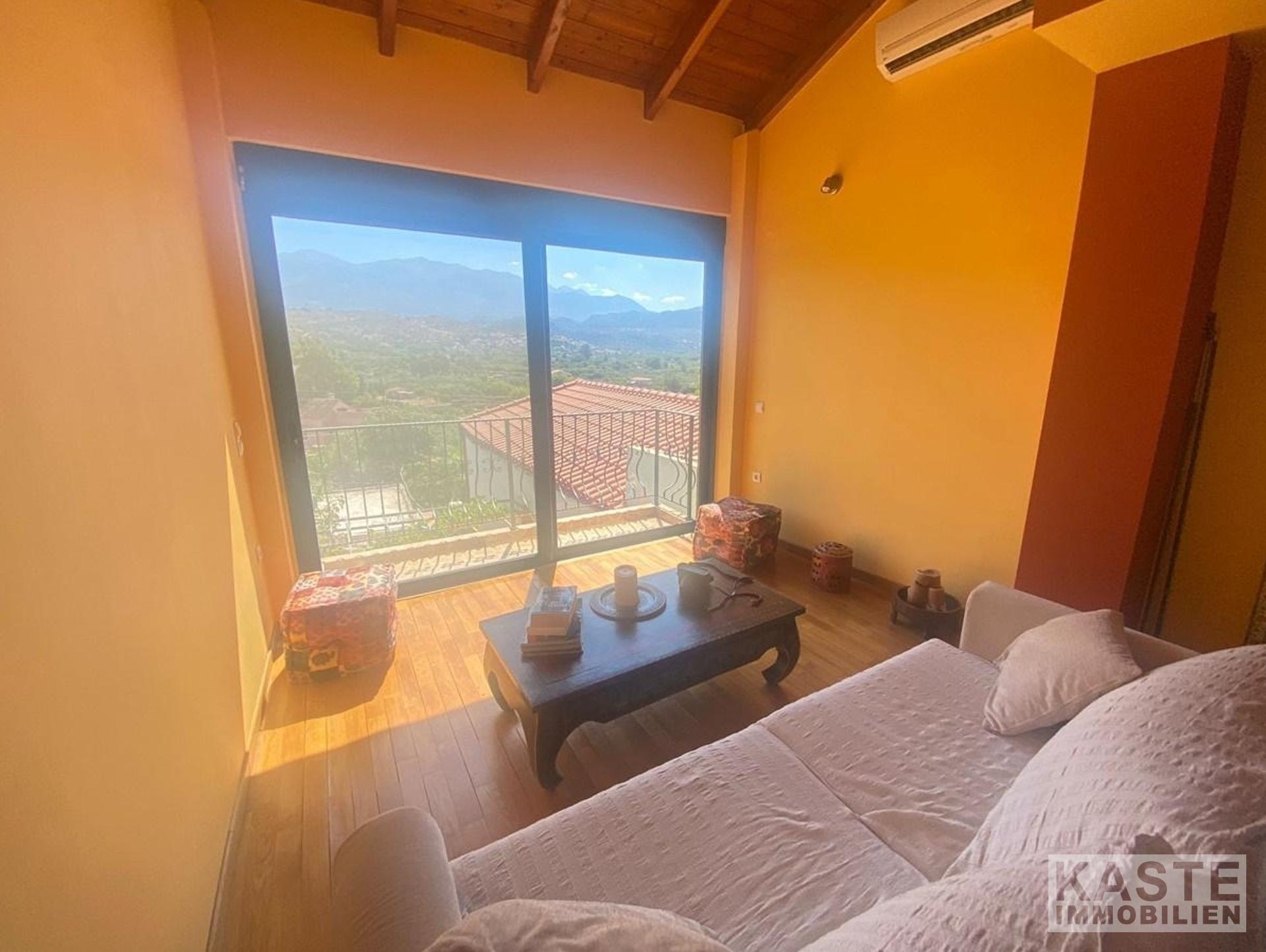 Auf der oberen Etage befinden sich zwei weitere Doppelschlafzimmer. Ein Schlafzimmer mit Doppelbett, in dem sich derzeit ein Schlafsofa und ein 4-türiger Einbauschrank befinden. Das zweite Schlafzimmer ist das Hauptschlafzimmer, das Platz für ein Kingsize-Bett bietet und derzeit über ein Doppelbett und eine zusätzliche Sitzecke verfügt. Dieses Zimmer hat zwei Balkone mit herrlichem Blick auf die weißen Berge.