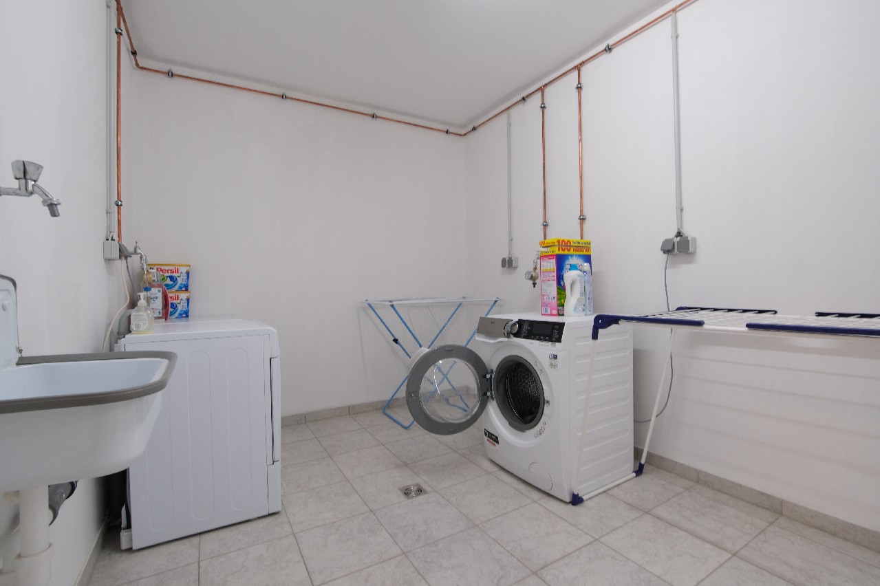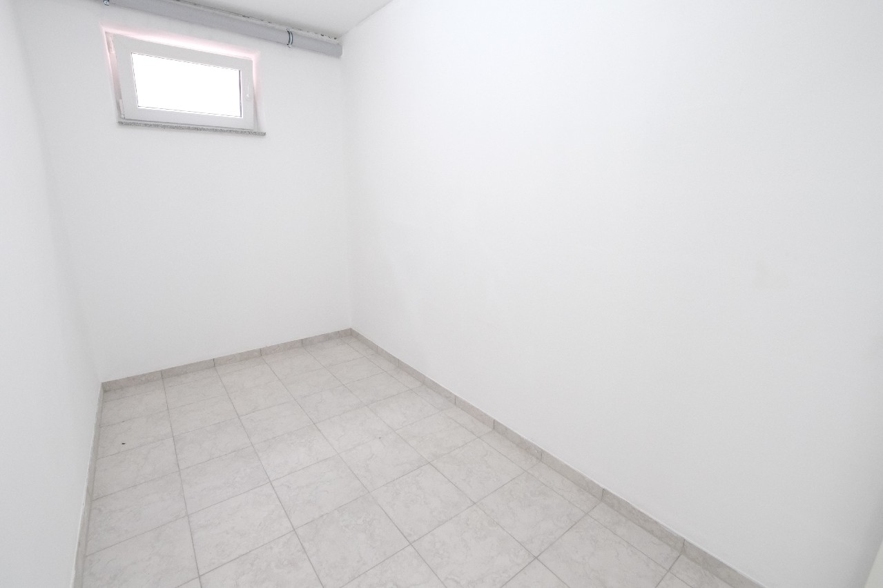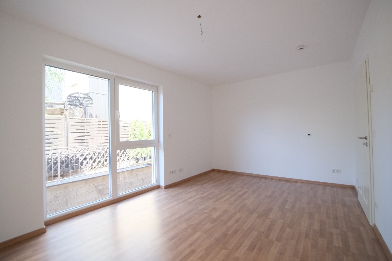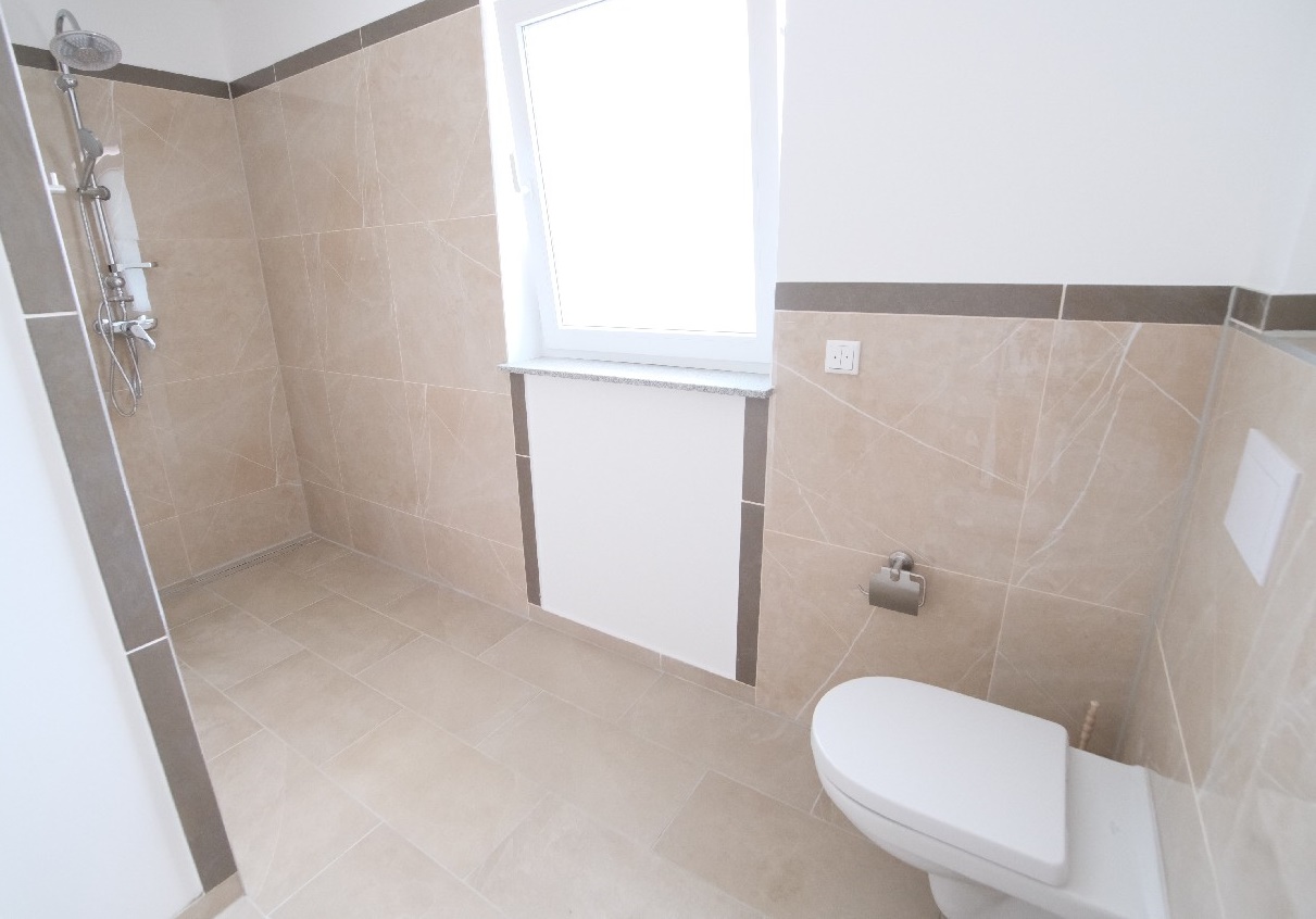 Untergeschoss: Hier befinden sich ein sehr großer und heller Schlafraum mit direktem Zugang zu einer weiteren Terrasse. Außerdem befindet sich angrenzend ein weiteres Tageslicht-Badezimmer mit Badewanne, barrierefreier Dusche, Handwaschbecken und WC.