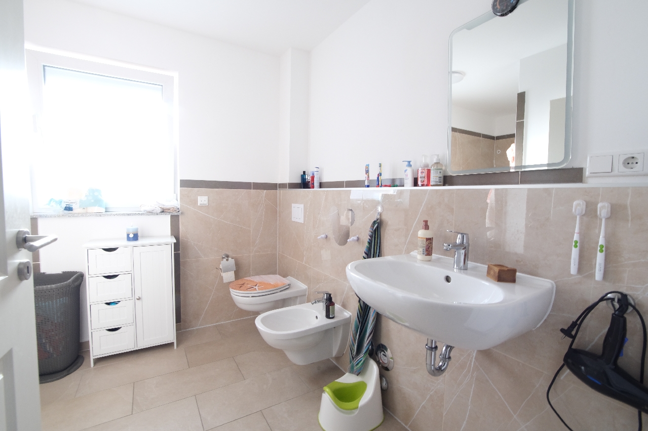 Erdgeschoss: Über einen hellen und einladenden Eingangsbereich gelangen Sie geradeaus in das lichtdurchflutete Wohnzimmer mit offener Küche und Zugangsmöglichkeiten auf zwei Terrassen. Das Elternschlafzimmer liegt rechts vom Wohnzimmer und hat ebenfalls einen Terrassenzugang. Links vom Eingang befindet sich das geräumige Kinderzimmer und rechts das moderne, hell geflieste Tageslichtbad mit großer barrierefreier Dusche, Handwaschbecken, WC und Bidet. Ebenfalls auf der rechten Seite des Eingangs gelangen Sie über eine Granittreppe mit Edelstahlhandlauf in die untere Etage.