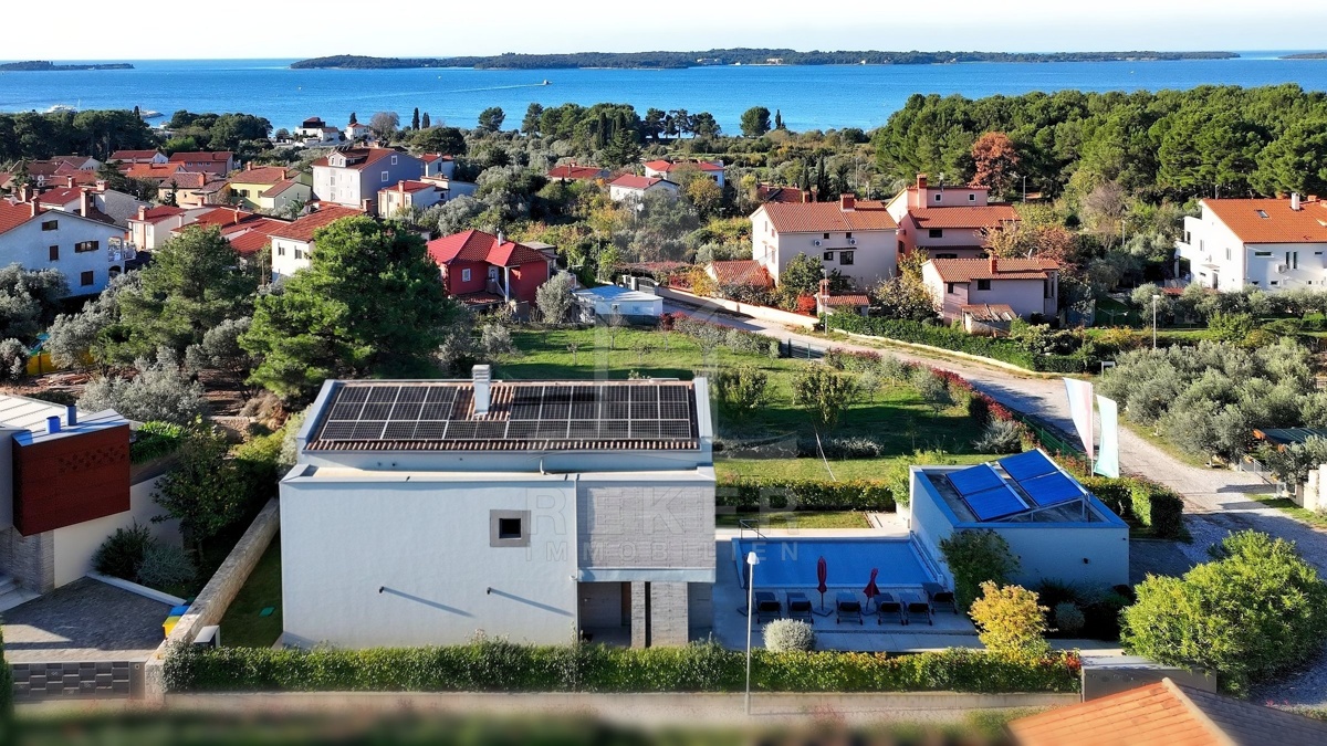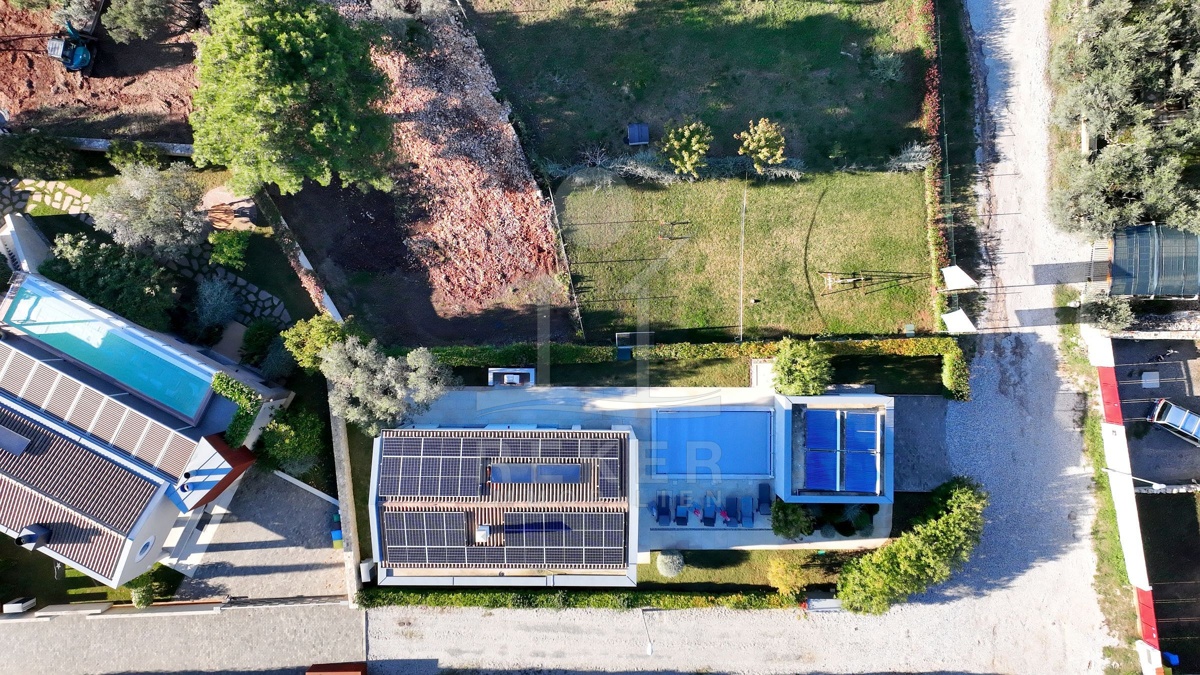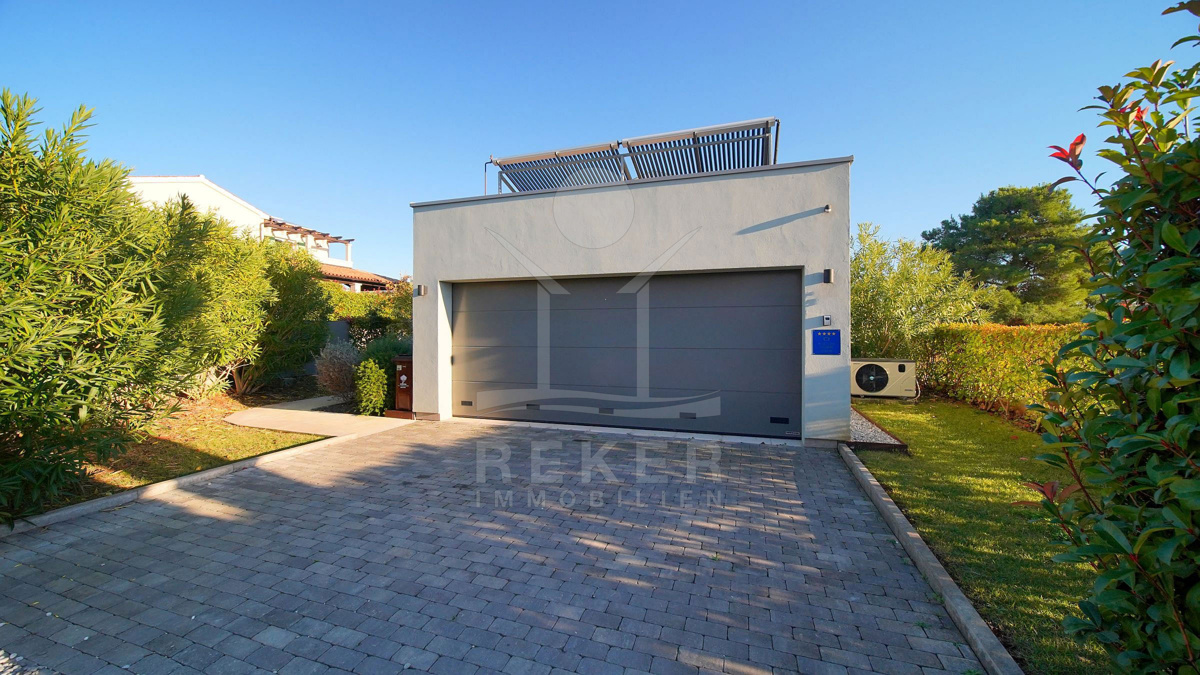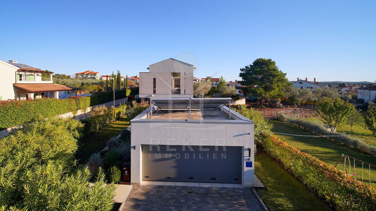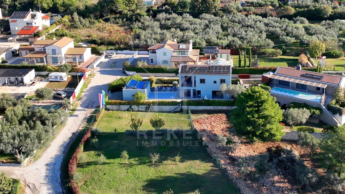 In Fažana, nur 750 Meter vom Meer entfernt, erwartet Sie diese moderne Villa mit freiem Blick Richtung Küste. Die Südwest-Ausrichtung schenkt Ihnen lange, helle Nachmittage und angenehme Abendstunden. Die Umgebung ist ruhig und gewachsen. Das Grundstück befindet sich vollständig im Baugebiet und ist über eine öffentliche Makadamstraße erreichbar. Die asphaltierte Straße ist etwa 100 Meter entfernt. Ihre Fahrzeuge parken Sie bequem in der 31,65 m² großen Garage mit Platz für zwei Autos.