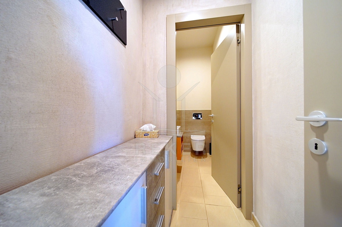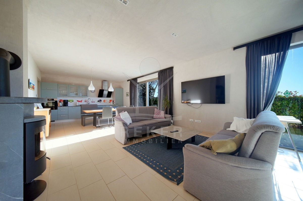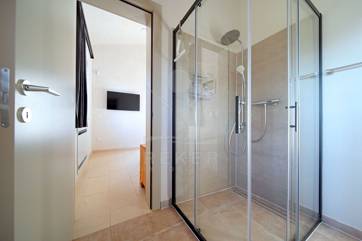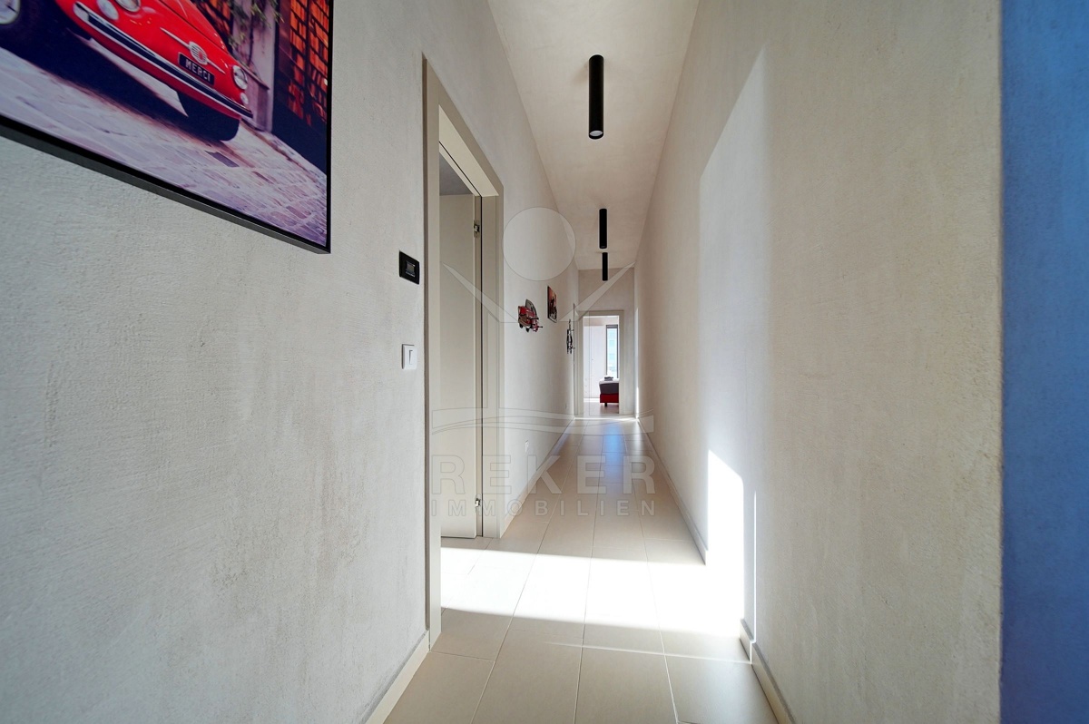 In Fažana, nur 750 Meter vom Meer entfernt, erwartet Sie diese moderne Villa mit freiem Blick Richtung Küste. Die Südwest-Ausrichtung schenkt Ihnen lange, helle Nachmittage und angenehme Abendstunden. Die Umgebung ist ruhig und gewachsen. Das Grundstück befindet sich vollständig im Baugebiet und ist über eine öffentliche Makadamstraße erreichbar. Die asphaltierte Straße ist etwa 100 Meter entfernt. Ihre Fahrzeuge parken Sie bequem in der 31,65 m² großen Garage mit Platz für zwei Autos.