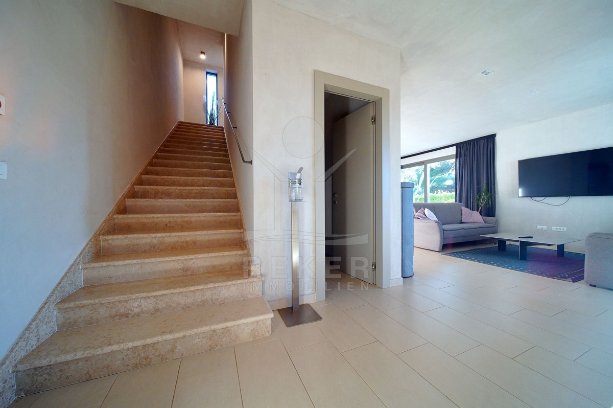 Auf 2.010 m² entfaltet sich ein mediterraner Garten mit Olivenbäumen, Kirschbäumen und Oleandern. Hecken und eine Betonmauer geben dem Grundstück klare Struktur und schützen Ihre Privatsphäre. Die automatische Bewässerung und die Außenbeleuchtung erleichtern die Pflege. Mittelpunkt des Außenbereichs ist der 34,65 m² große, beheizte Skimmerpool in Betonkonstruktion mit Mosaikoberfläche. Direkt daneben: die Sonnenterrasse mit Liegen. Die überdachte Terrasse im Erdgeschoss erweitert den Wohnbereich ins Freie und schafft zusätzlichen Raum für gemeinsame Stunden.