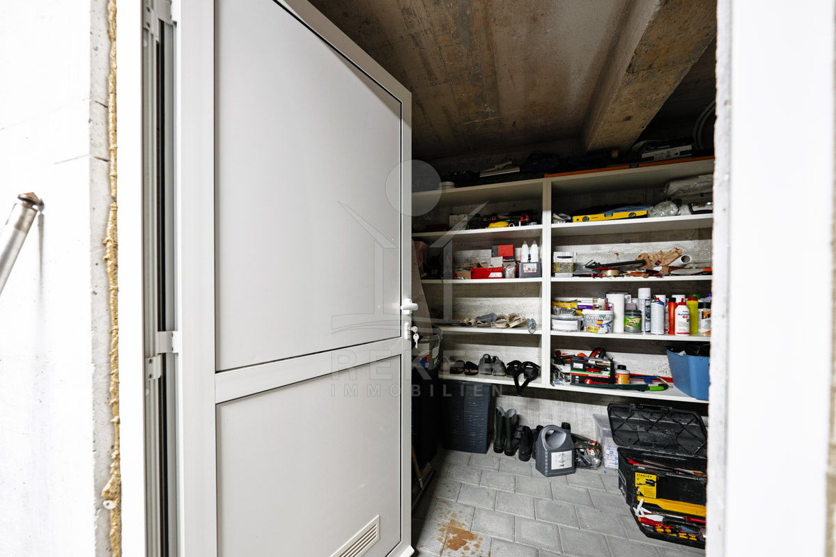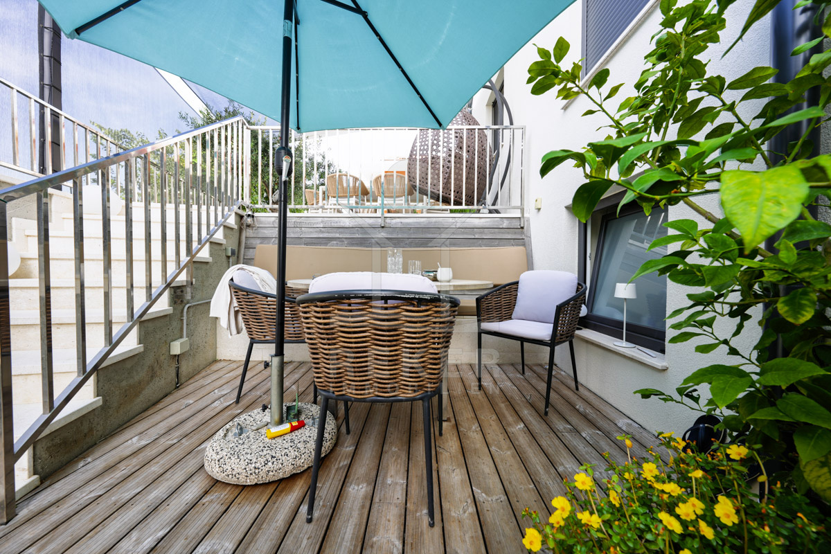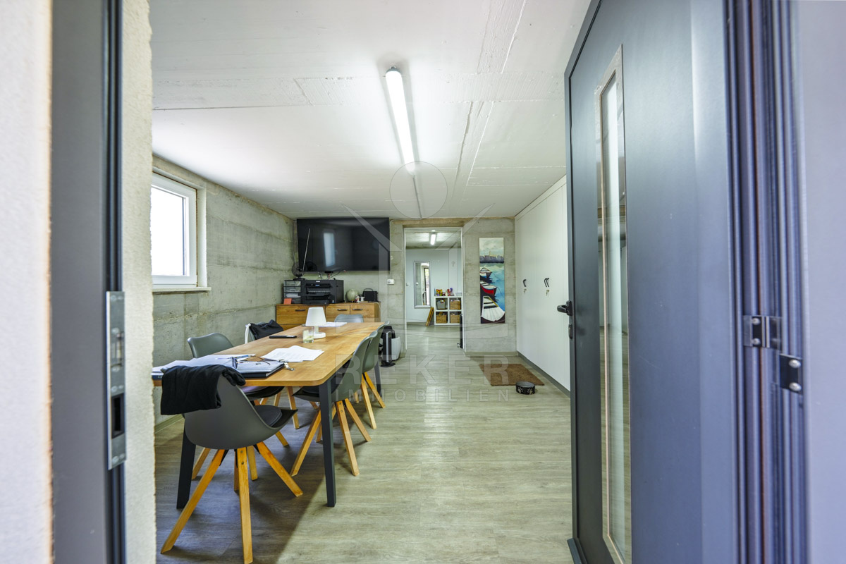Das 629 m² große Grundstück wirkt gepflegt und offen gestaltet. Mittelpunkt des Außenbereichs ist der 60 m² große Pool (10 × 6 m), vorbereitet für eine Beheizung und damit auch in der Übergangszeit nutzbar. Liegeflächen und eine Außendusche ergänzen diesen Bereich. Der überdachte Grillplatz mit Außenküche und Steingrill schafft Raum für gemeinsame Abende. Direkt daneben ergänzt eine Taverne mit Sommerküche im Untergeschoss den Außenbereich um einen geschützten Aufenthaltsraum.