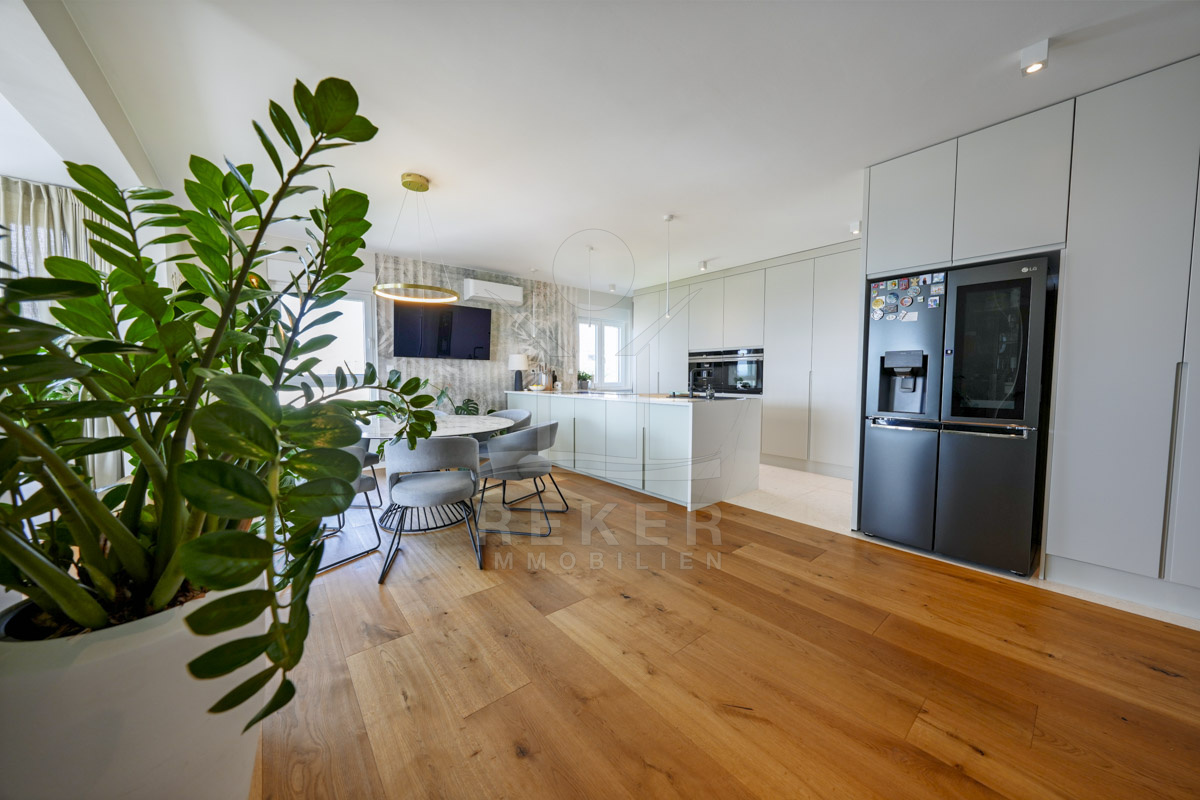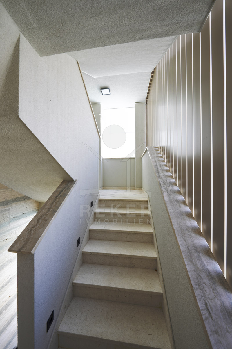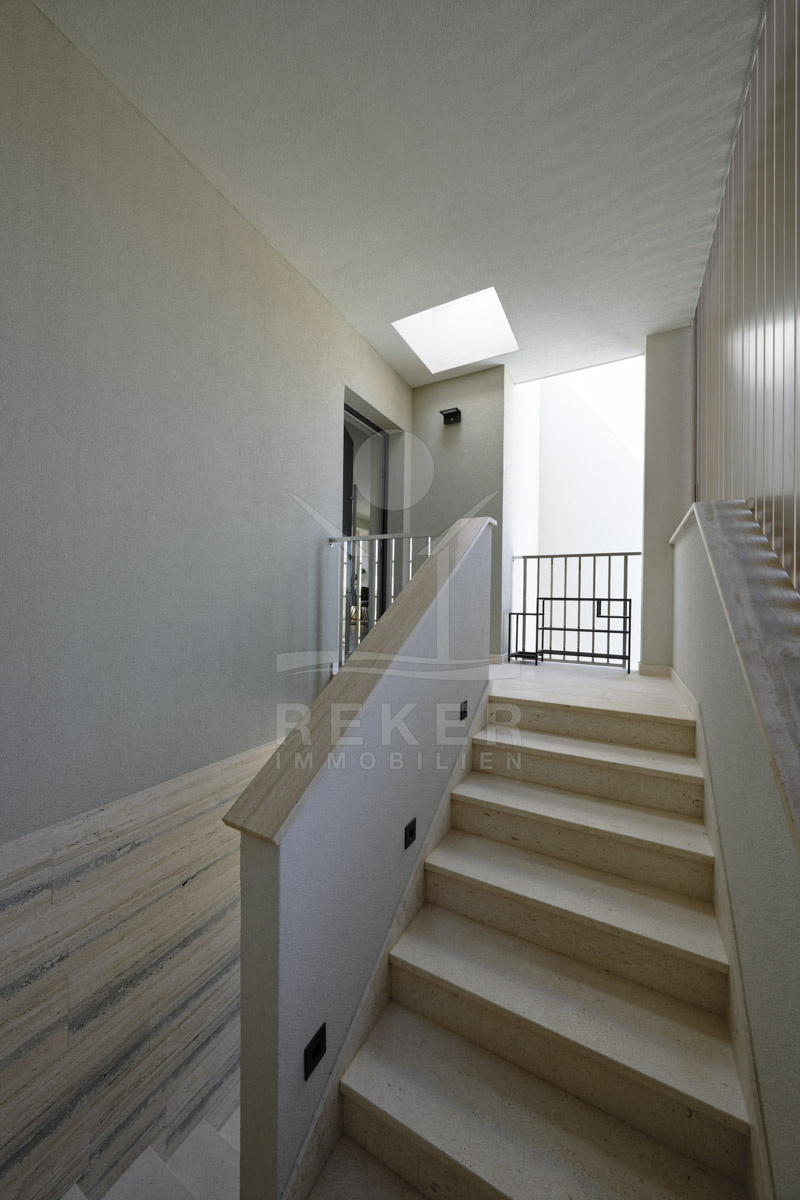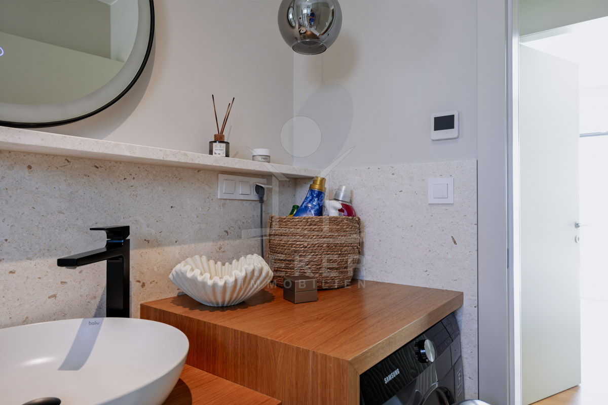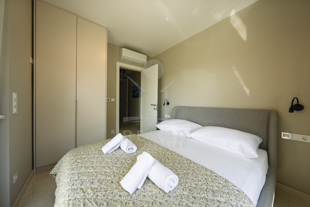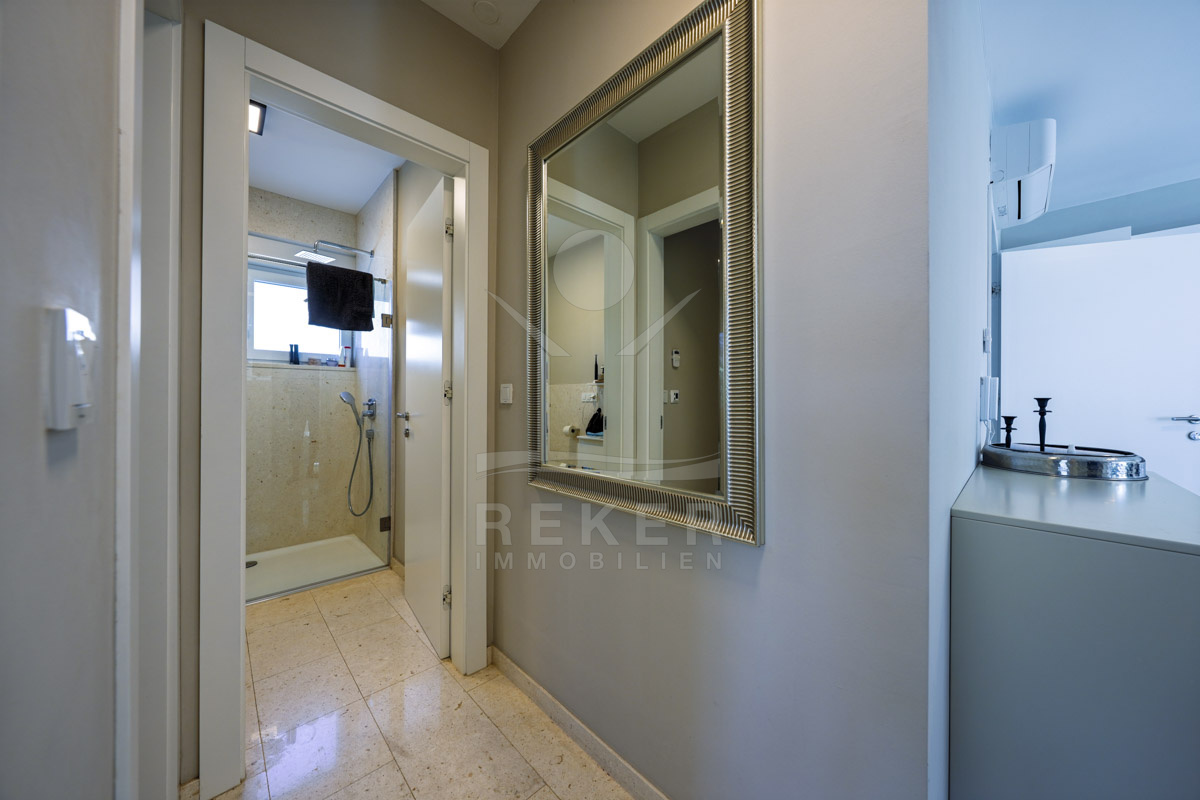 Die Neubauvilla aus dem Jahr 2023 befindet sich in einer ruhigen Wohngegend von Vodice, rund 500 Meter vom Meer entfernt. Sie wohnen abgeschirmt und dennoch nah an Strand und Zentrum. Aus den oberen Etagen reicht der Blick bis zum Meer. Sechs Stellplätze stehen zur Verfügung, zwei in der Garage, vier vor dem Haus. Praktisch bei mehreren Nutzern.