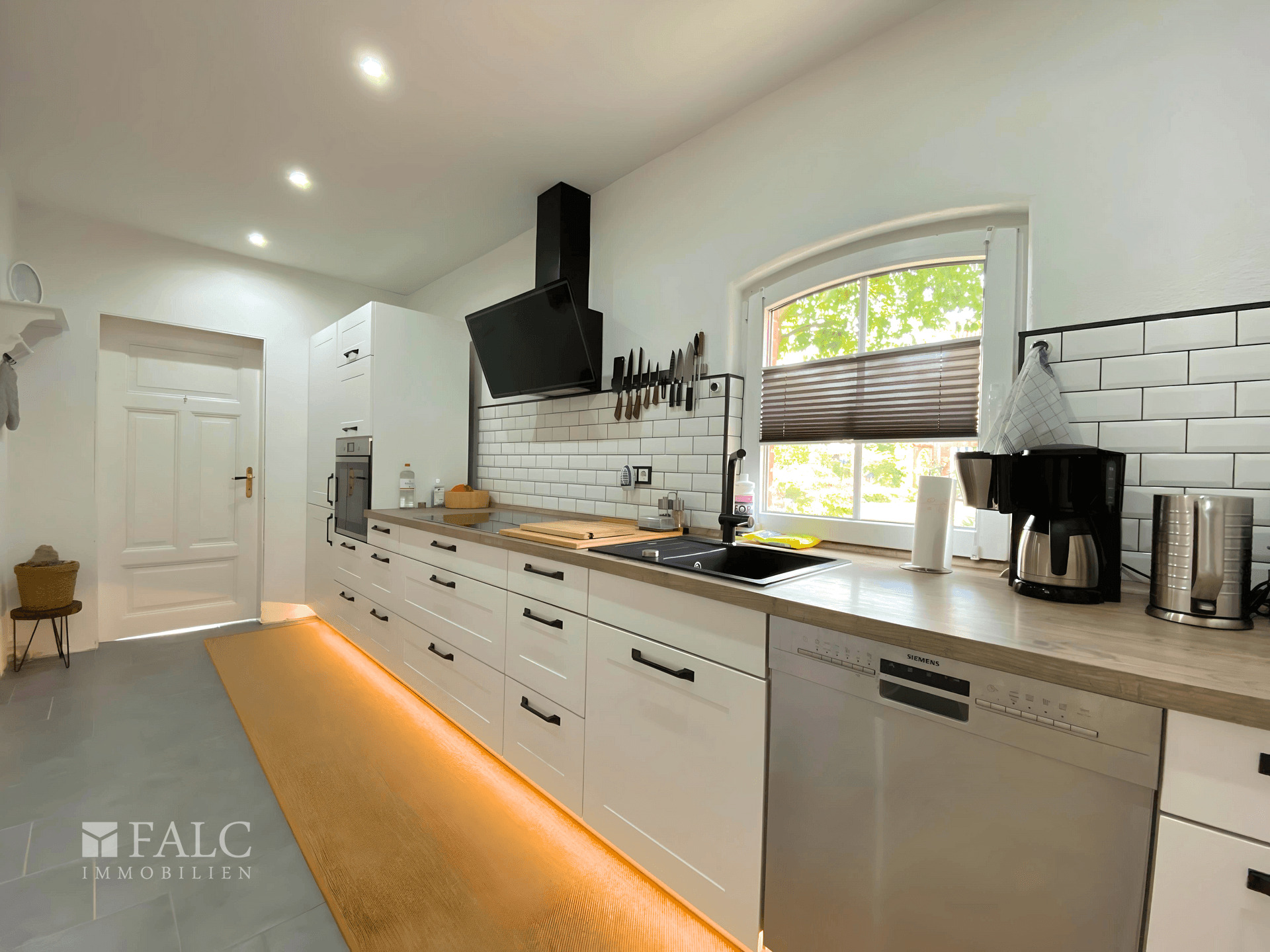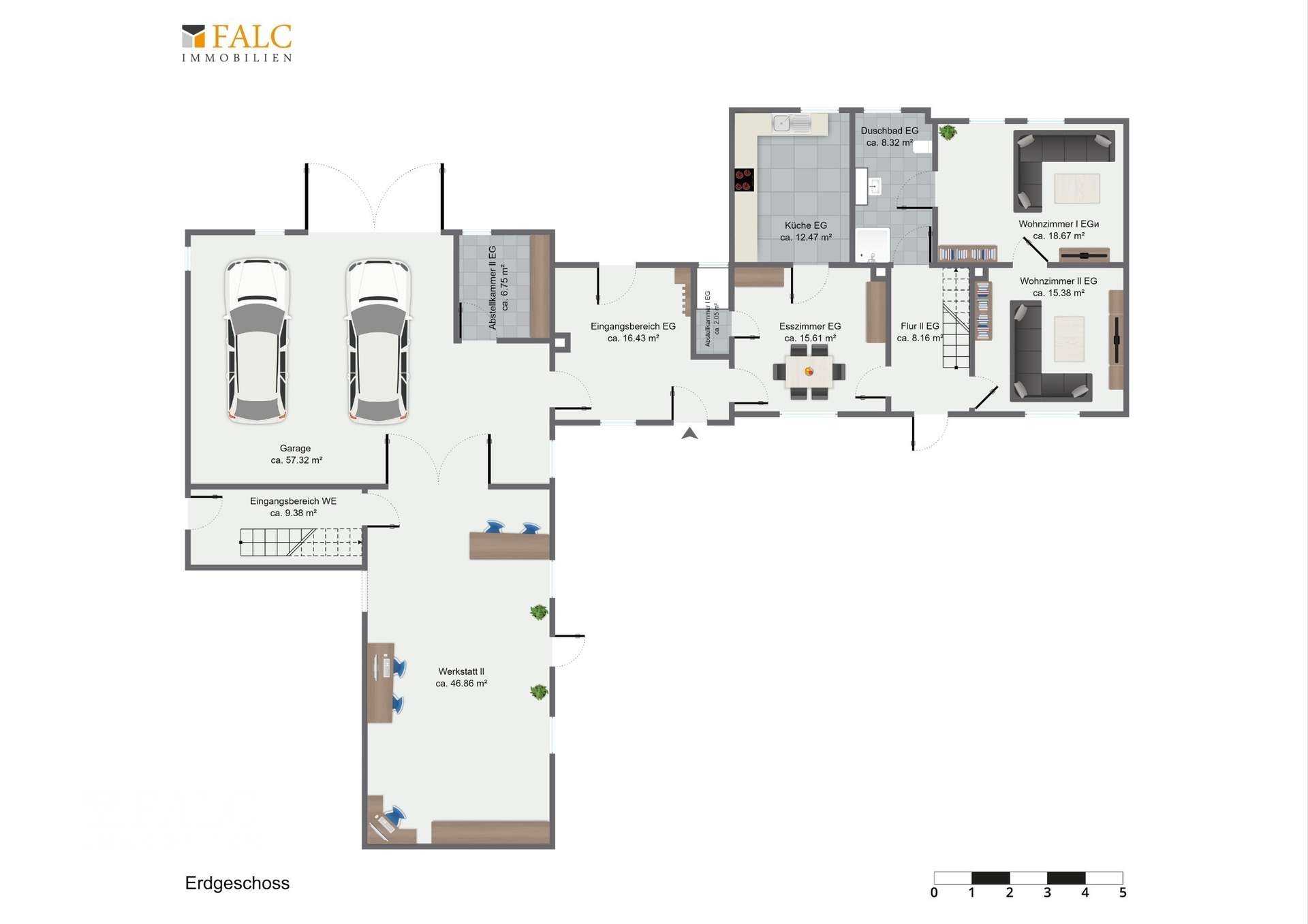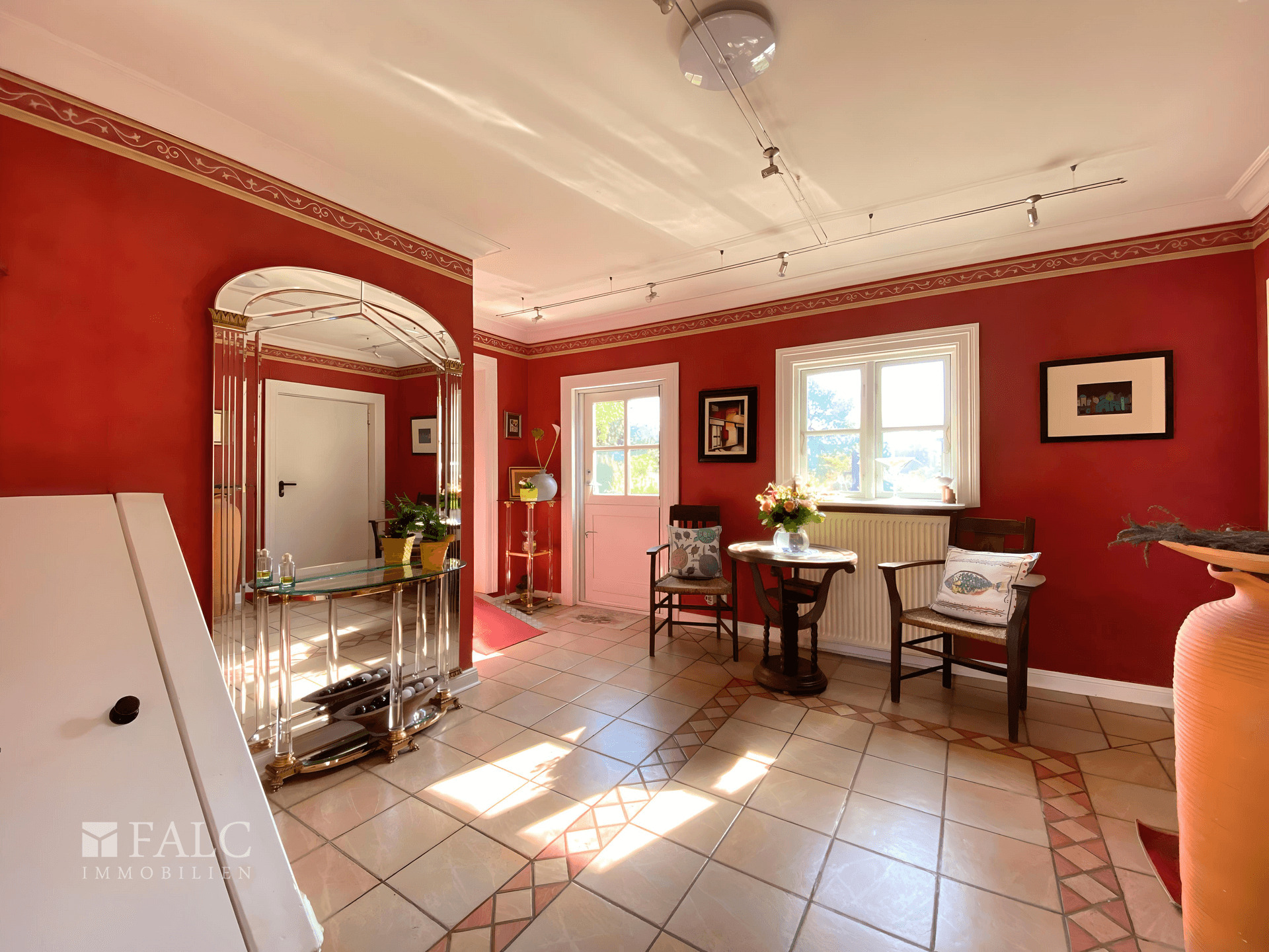 Das Haupthaus erstreckt sich über circa 190 Quadratmeter Wohnfläche und beeindruckt mit einer durchdachten Raumaufteilung sowie hochwertiger Ausstattung. Schon beim Betreten des großzügigen Eingangsbereichs wird klar, dass hier Komfort und Funktionalität im Vordergrund stehen. Der Eingangsbereich verbindet das Wohnhaus direkt mit der angrenzenden geräumigen Garage (ca. 55 m²) und der Werkstatt (ca. 45 m²), die über viel Platz für Hobby und Handwerk verfügt. Der Zugang zum Keller befindet sich ebenfalls im Eingangsbereich.